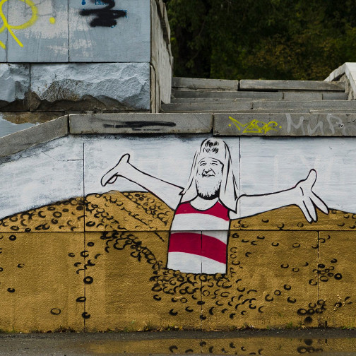 Художник из Екатеринбурга нарисовал патриарха Кирилла в образе Скруджа МакДака, купающегося в золоте
