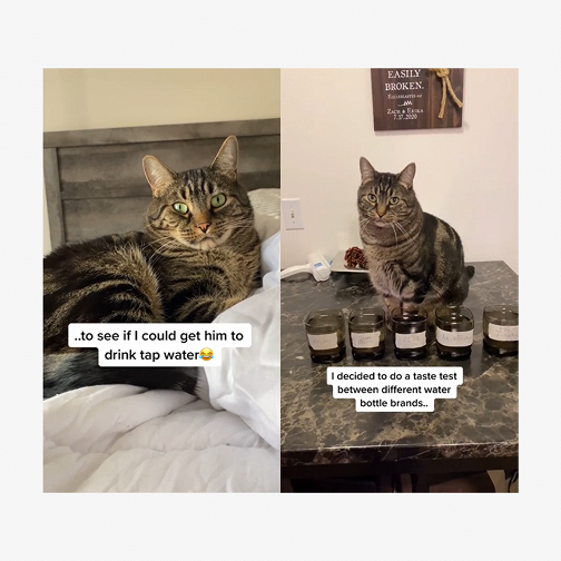 Кот-гурман пьет только бутилированную воду. Он пробует разные бренды и выбирает лучшую