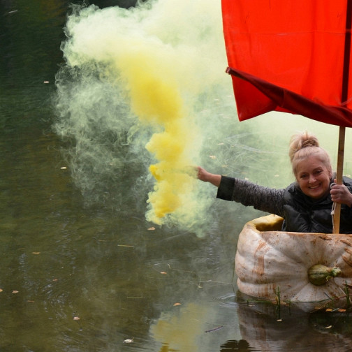 Петербурженка устроила заплыв по озеру в гигантской тыкве