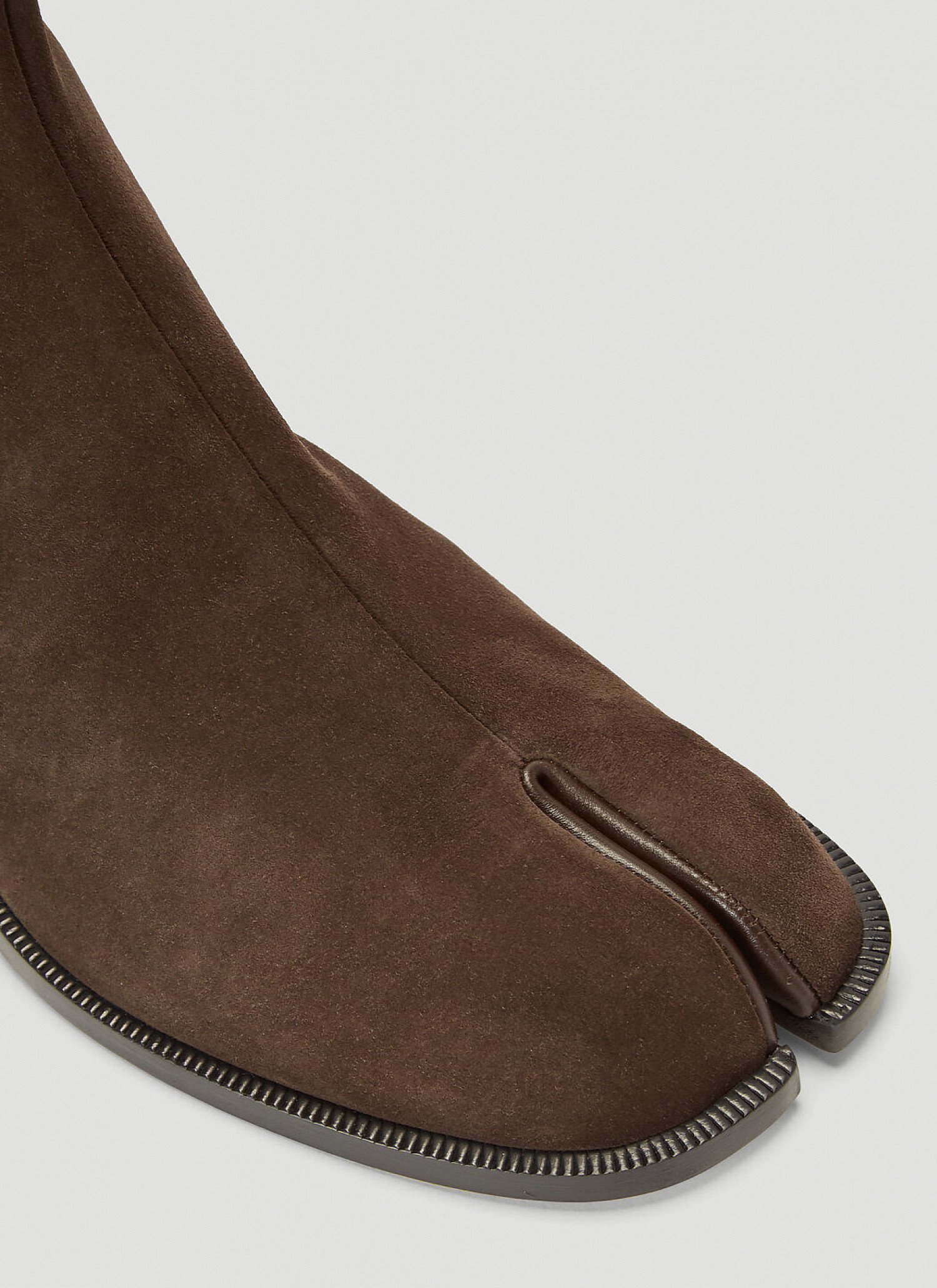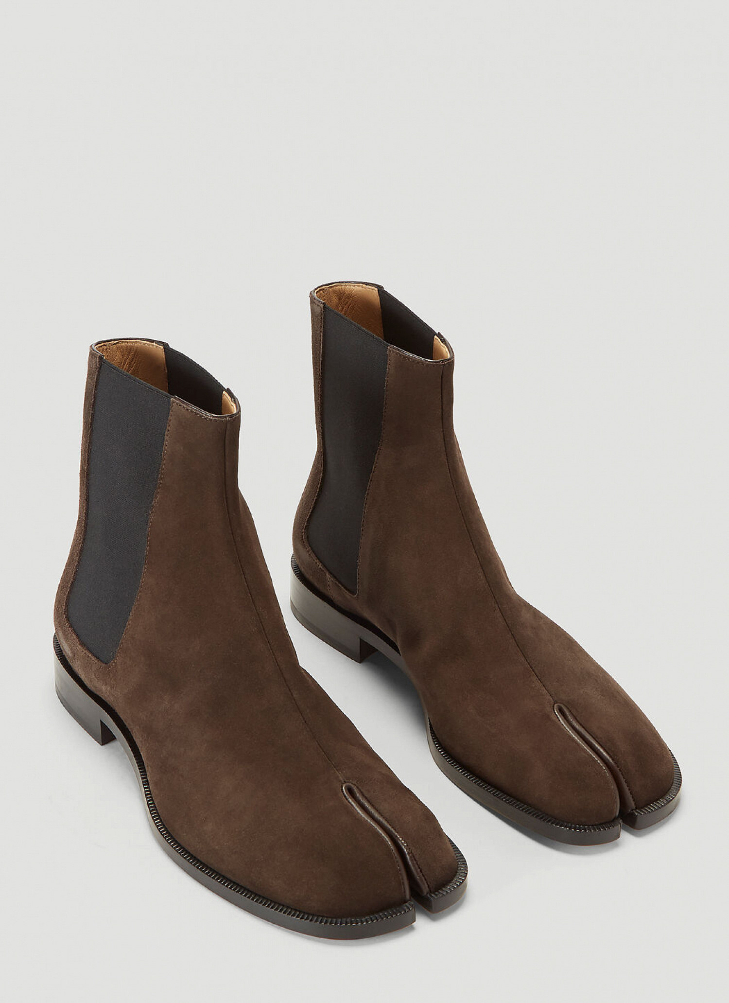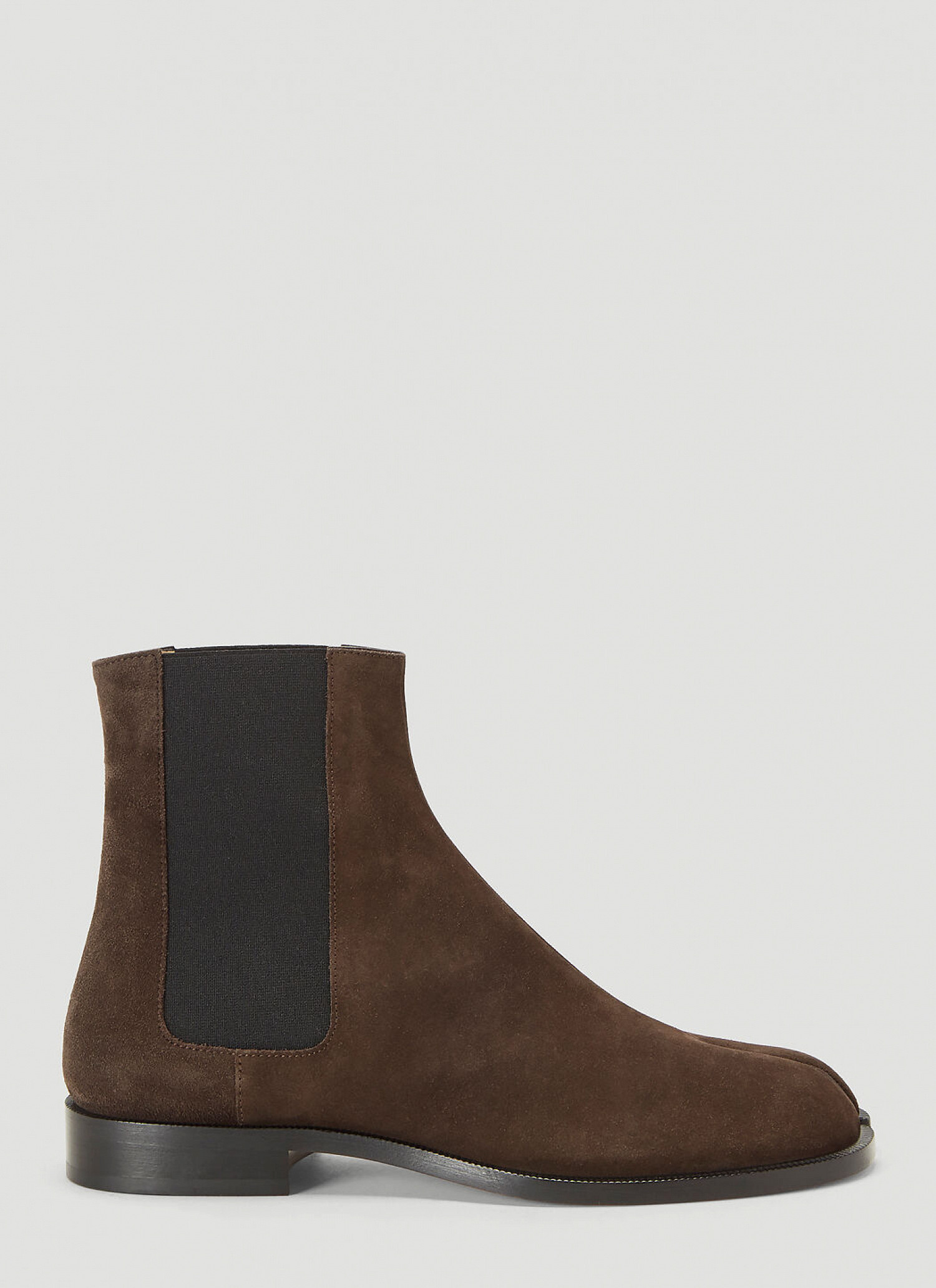 Maison Margiela продолжает эксперименты с таби и выпускает ботинки челси. Новая пара, переосмысливающая классический силуэт обуви, получилась более традиционной, чем предыдущая. Верх ботинок выполнен из темно-коричневой мягкой замши, а боковые панели дополнены толстыми эластичными вставками. В основании пары — черная подошва с небольшим каблуком и контрастной белой строчкой. Носок с квадратными очертаниями разделен кожаной отделкой.