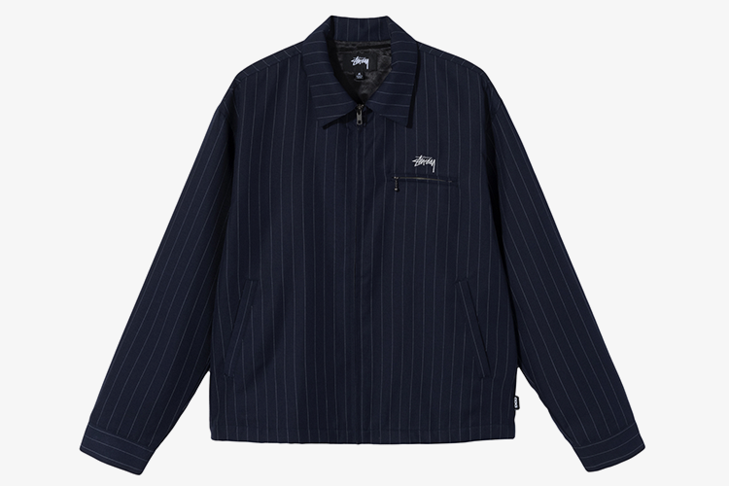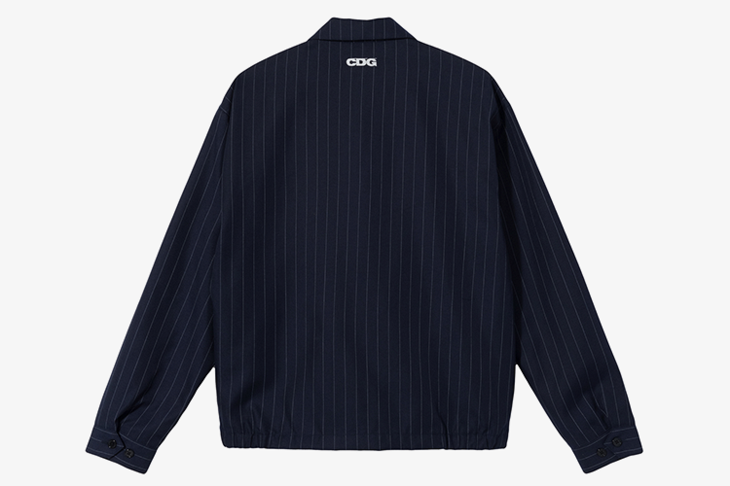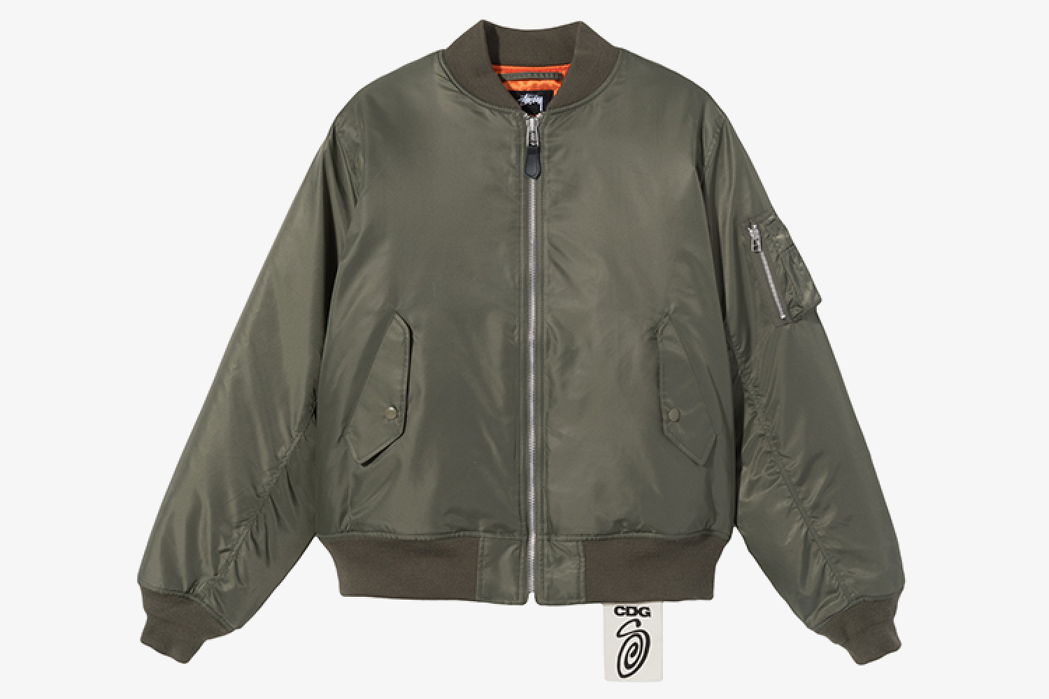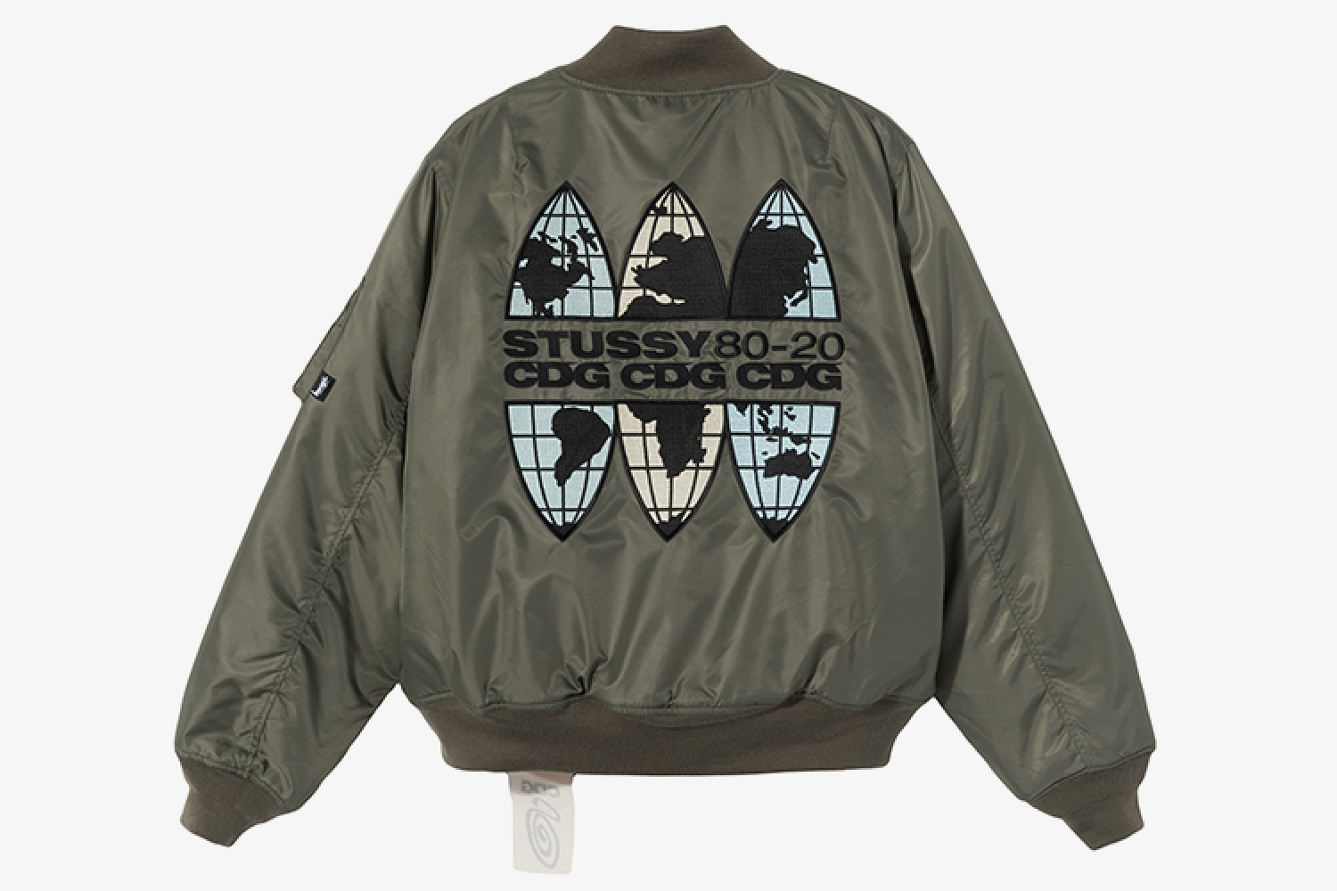 Особенно выделяется темно-синий расслабленный комплект из куртки и брюк в полоску. Этакая неформальная альтернатива костюму. Еще отдельного упоминания заслуживает традиционный зеленый бомбер, декорированный броской вышивкой на спине. Также в коллаборацию вошли футболки, лонгсливы, панама и холщовый бомбер. Все они украшены совместным брендингом Stüssy и CDG