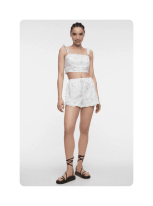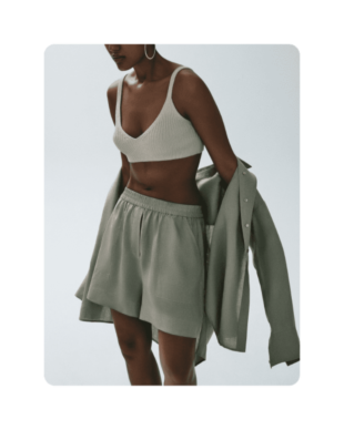 Один из наших любимых летних материалов: в льняных вещах не жарко, а еще они выглядят в по-хорошему расслабленно и нарядно, даже будучи слегка мятыми. К льняным шортам можно добавить рубашку из того же материала — у многих брендов найдутся уже готовые комплекты — или спортивный кроп-топ и легкую рубашку.