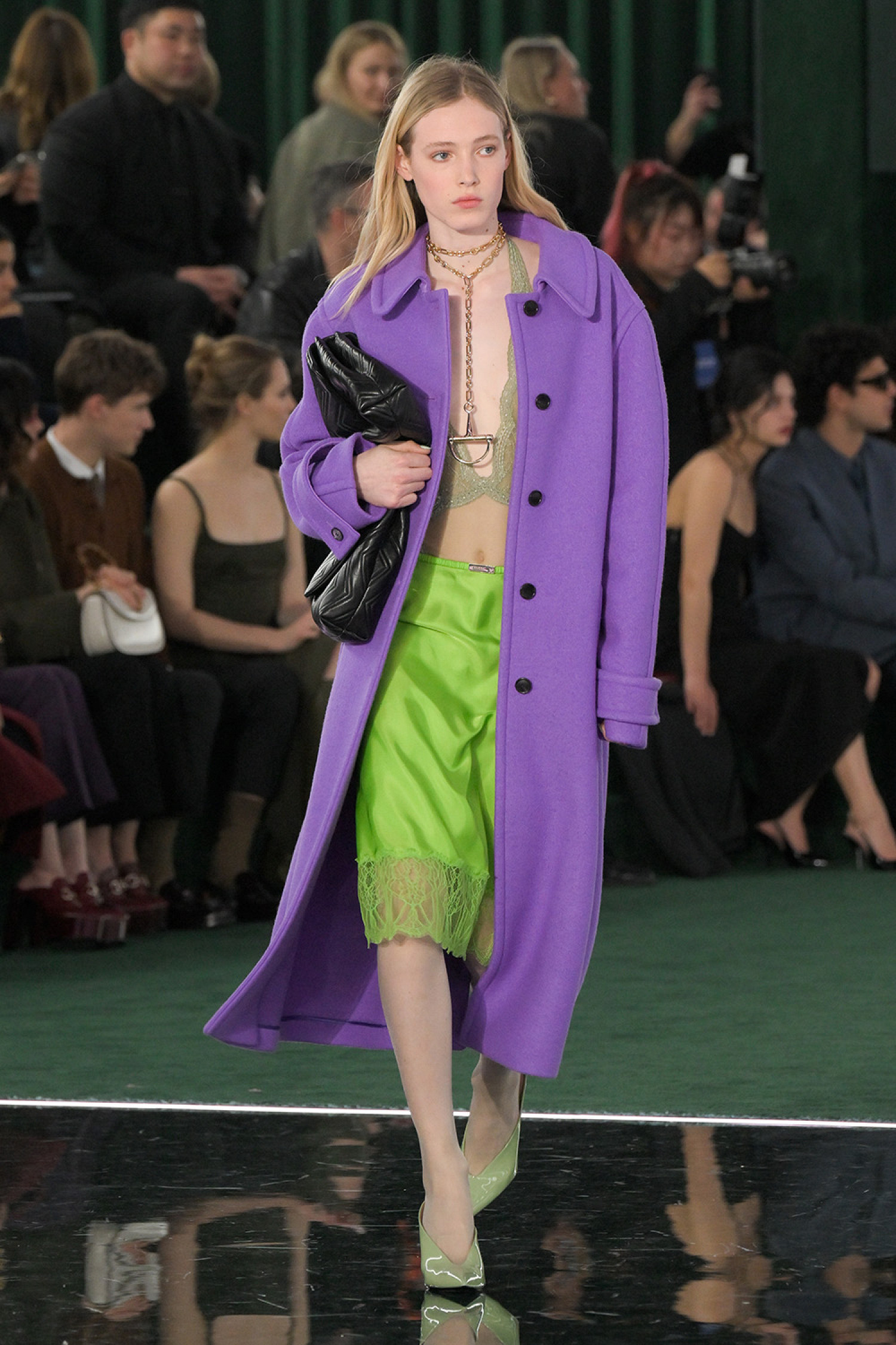 Фиолетовый цвет, начиная с византийской эпохи, ассоциируется с богатством. Дизайнеры предлагают усилить эту связь и носить вещи в пурпурных тонах из благородных материалов — бархата, замши и шелка. Стилизовать фиолетовый легче, чем можно подумать. Рассматривайте его как более роскошную альтернативу черному и подбирайте в пару любой из остальных четырех модных цветов сезона: зеленый васаби и шоколадный (шоу Gucci), горчичный (Miu Miu) или красный.