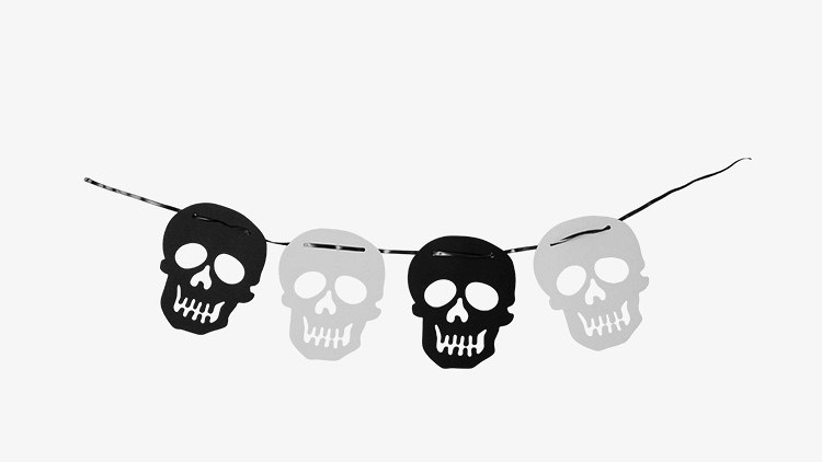 На один вечер меняем гирлянды с надписями и сердечками на черно-белые черепа. Лаконичный, но безоговорочный способ украсить пространство для вечеринки. Можно дополнить красной надписью «Happy Halloween» или бумажными летучими мышами.