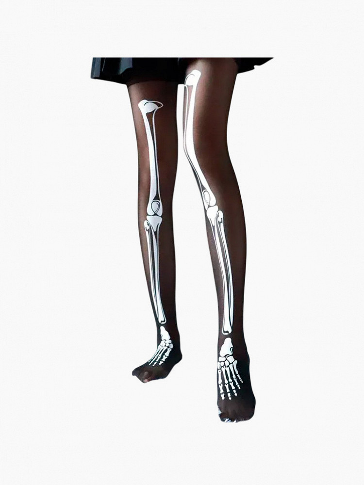 Капроновые колготки с вайбом tumblr girl и первых сезонов «Американской истории ужасов». На черном фоне — яркий белый рисунок в виде скелета.
