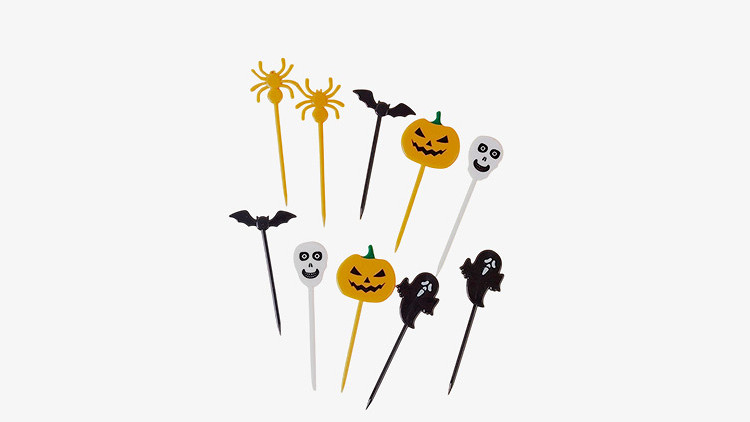 Для конфет, десертов, капкейков, мини-бутербродов и нарезок — десять пластиковых топперов с пауками, тыквами, привидениями и скелетами. Мелочь, но сервировку стола дополняет неплохо.