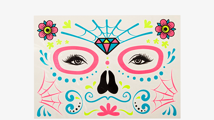 Если заморачиваться с макияжем не хочется, есть готовый вариант. Временные татуировки в мексиканском стиле легко наносить и снимать с помощью воды. А еще они светятся в темноте!