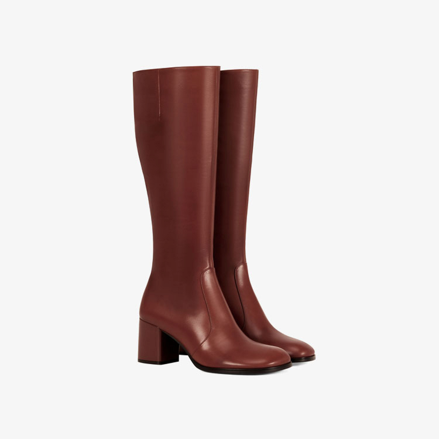 Длина миди подойдет не всем, но образ Кэролин хорош из-за сочетания цветов. Его можно повторить и с более короткой юбкой, и даже с брюками. В последнем случае сапоги лучше заменить на ботильоны похожего оттенка.