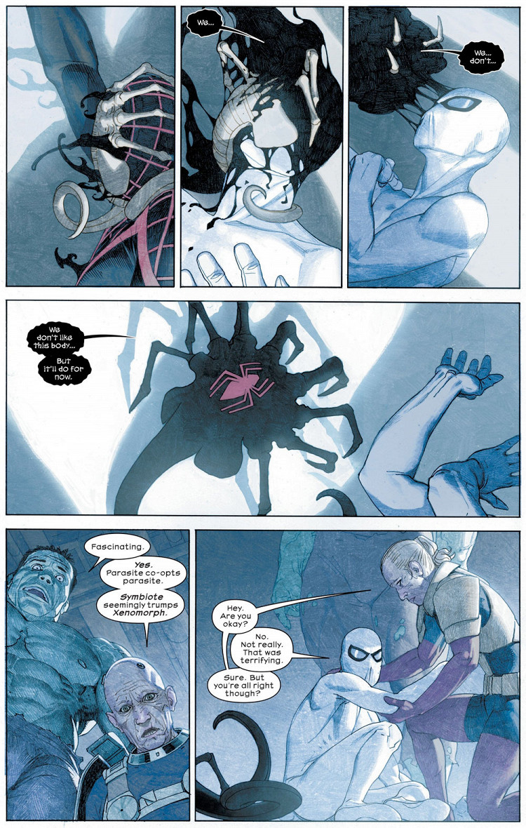 И хотя в «Чужих против Мстителей» самого Дэвида не так много (по сути, он получил что-то вроде расширенного камео), этот комикс за отсутствием лучших предложений можно воспринимать концовкой ридли-скоттовской трилогии. По сюжету андроид успел не только получить под свое управление колонию ксеноморфов, но и открыл способ путешествовать в альтернативные реальности, где встретил других Дэвидов. Вместе они отправились выжигать кислотой жизнь во всей мультивселенной, пока не наткнулись на мир Marvel. История стартует с места в карьер: почти вся галактика покорена полчищами Чужих, лишь горстка выживших супергероев держит оборону.