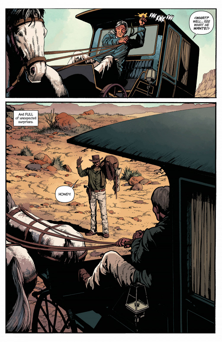 Авторы сразу идут с козырей. Если вторая (возможно, лучшая) часть кинотрилогии с ее альтернативным 1985 годом вам казалась достаточно безумной, то комикс-серия — настоящий темпоральный сдвиг по фазе. Действие в комиксах происходит до, во время и после фильмов, поэтому вы узнаете, как док Браун познакомился с Марти МакФлаем и как Марти начал встречаться со своей девушкой Дженнифер Паркер. Как док участвовал в Манхэттенском проекте, почему сгорел дом Браунов и, наконец, как ученый построил на Диком Западе поезд времени — причем последнее мы узнаем со слов его жены Клары, ведь в комиксах женским персонажам (в том числе Дженнифер, которая становится спутницей Марти в его приключениях) было уделено гораздо больше внимания, чем в фильмах, что всегда считалось их ахиллесовой пятой.