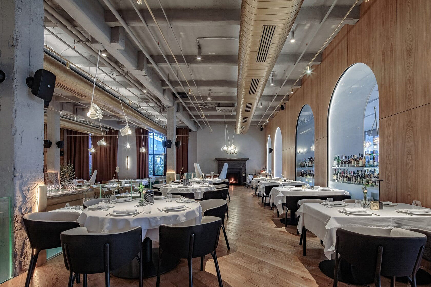 В основном меню — хумус из креветок, буррата с жжеными перцами и чоризо, бифштекс из кролика с морковным кремом, филе дорадо с маринарой и неаполитанская пицца, тесто для которой бродит 14 часов.