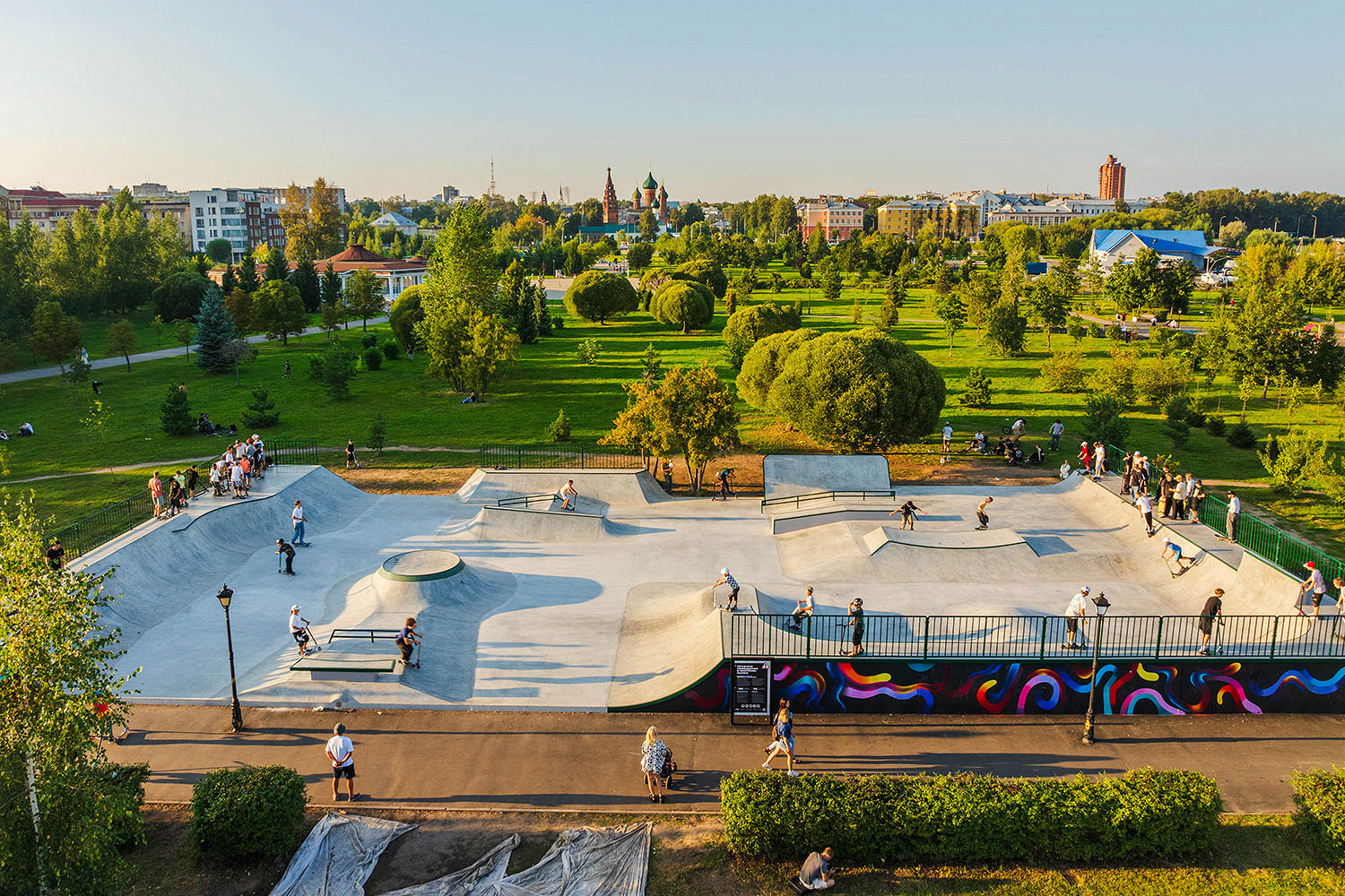 В современном парке на берегу реки Которосль находится главная бетонная скейт-площадка Ярославля. С момента открытия она стала точкой притяжения модных ребят: здесь они тренируются, соревнуются и тусуются. Кроме них за оттачиванием трюков можно заметить как детей, так и людей за сорок. «Популярность спота зашкаливает, и иногда на нем бывает тесно», — поделились с нами местные скейтеры. Сигнал для городских властей: Ярославлю нужно больше таких пространств!