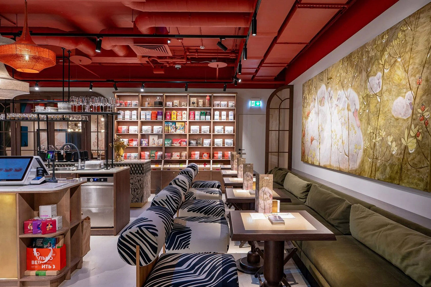 Самая просторная чайная небольшой сети, с общим столом для праздничных чаепитий и мягкими диванчиками. На стеллажах расставлены нарядные упаковки с чаем и сопутствующие чаепитию мелочи.
