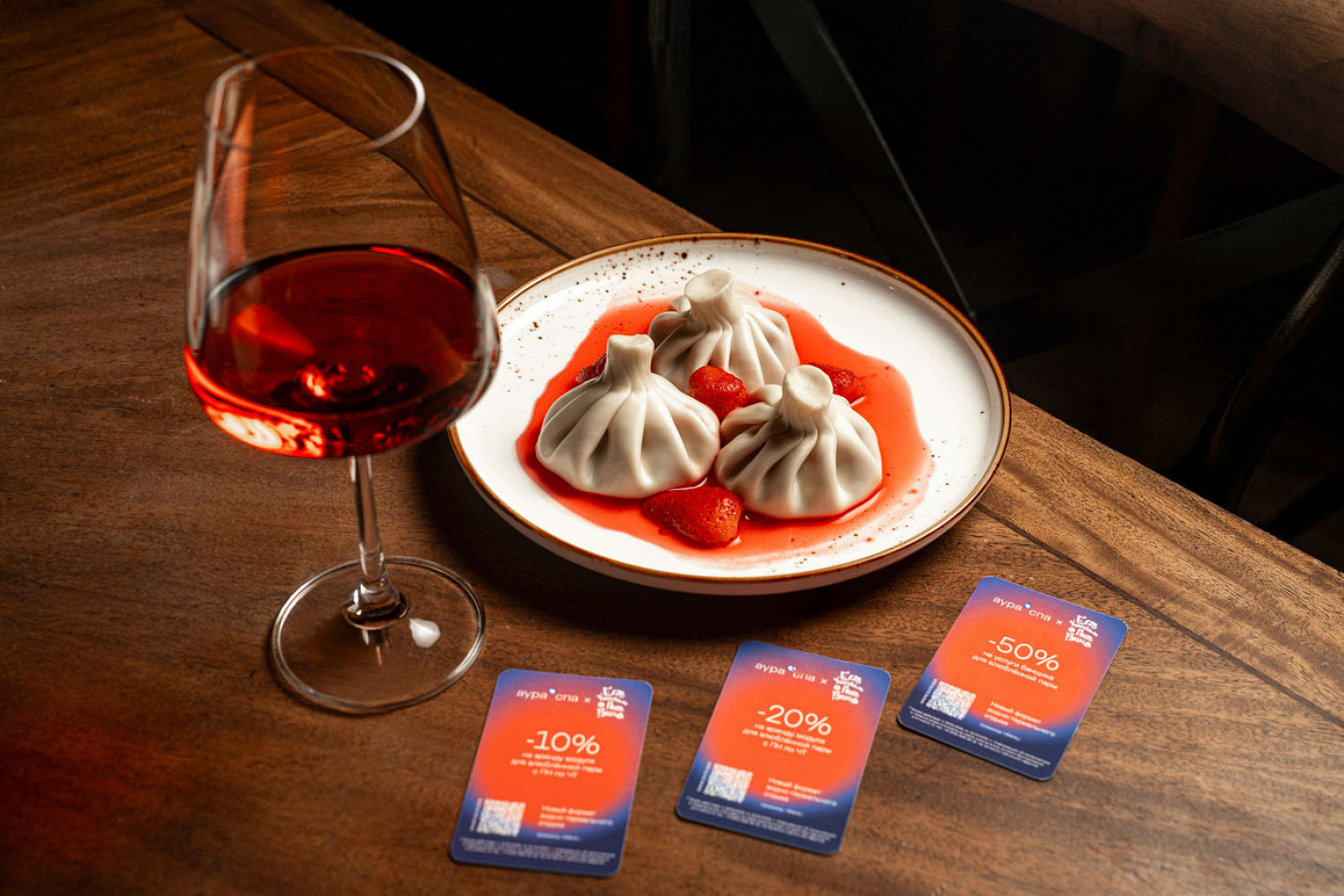 Сеть ресторанов совместно с банным комплексом «Аура Спа» запустила сет «для двоих» в честь Дня святого Валентина. В него входят два бокала розового вина, шесть фирменных хинкали с клубникой и сертификат в подарок от спа-комплекса — это может быть скидка 10 или 20% на двухчасовое парение или скидка 50% на услуги банщика. Попробовать спешел и выиграть приз можно с 9 по 15 февраля.