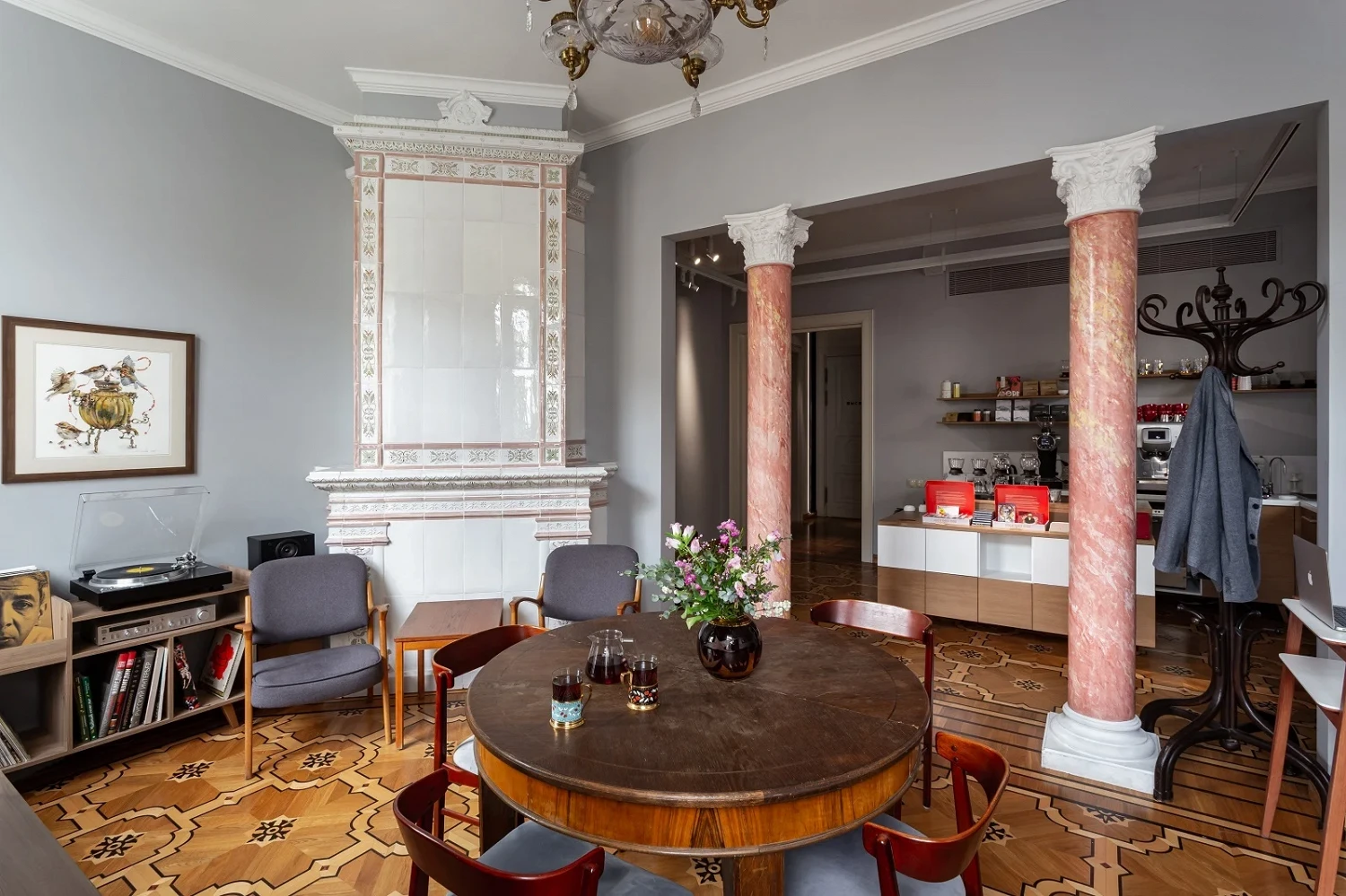 Не кофе, а чай! Нарядная чайная в особняке при центре Вознесенского (где бывают отличные камерные выставки) напоминает светскую гостиную: большой стол, тяжелые кресла и полки с книгами. За стойкой готовят чай и чайные напитки: например, могут заварить чайничек габы или фирменный купаж, налить чая из огромного самовара или приготовить чайный раф с лаймом.