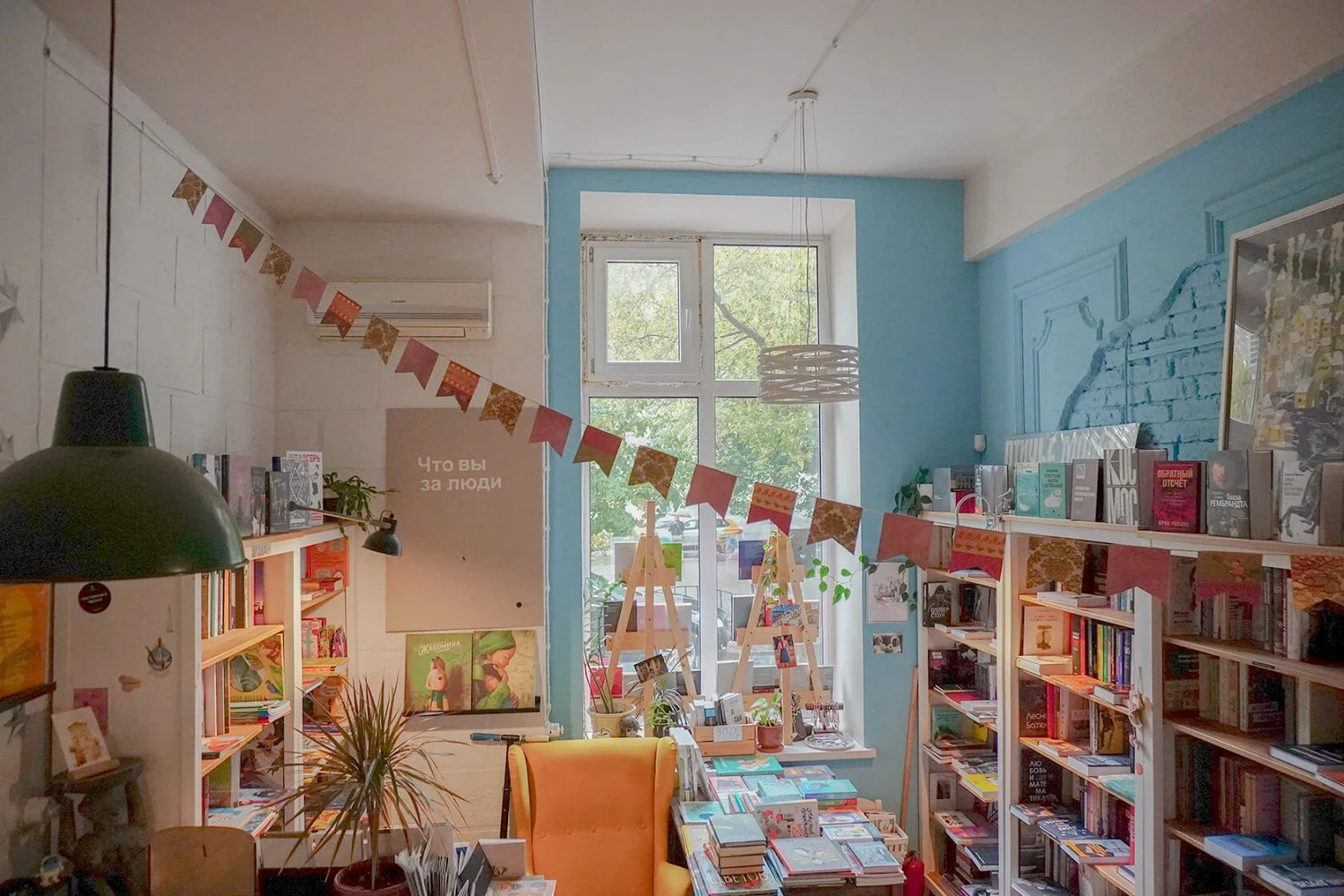 У петербургского издательства «Поляндрия» в Москве работает собственный домик — светлое пространство с книжными стеллажами, большим коммунальным столом и кофейней Letters. Внутри достаточно многолюдно, но спокойно: есть диванчики, чтобы поболтать и устроиться с книгой. Среди литературы — много красиво оформленных детских книг, янг-адалта и подростковой литературы.