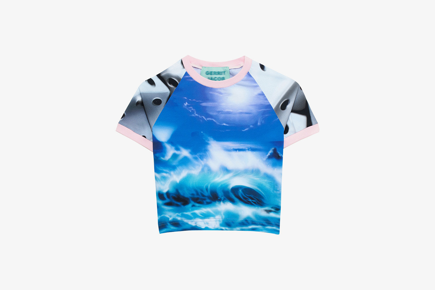Облачные завихрения, синее небо и космическое сияние. У бренда Gerrit Jacob легко собрать тотал-лук: помимо футболки, есть джинсы с таким же принтом и рубашка.