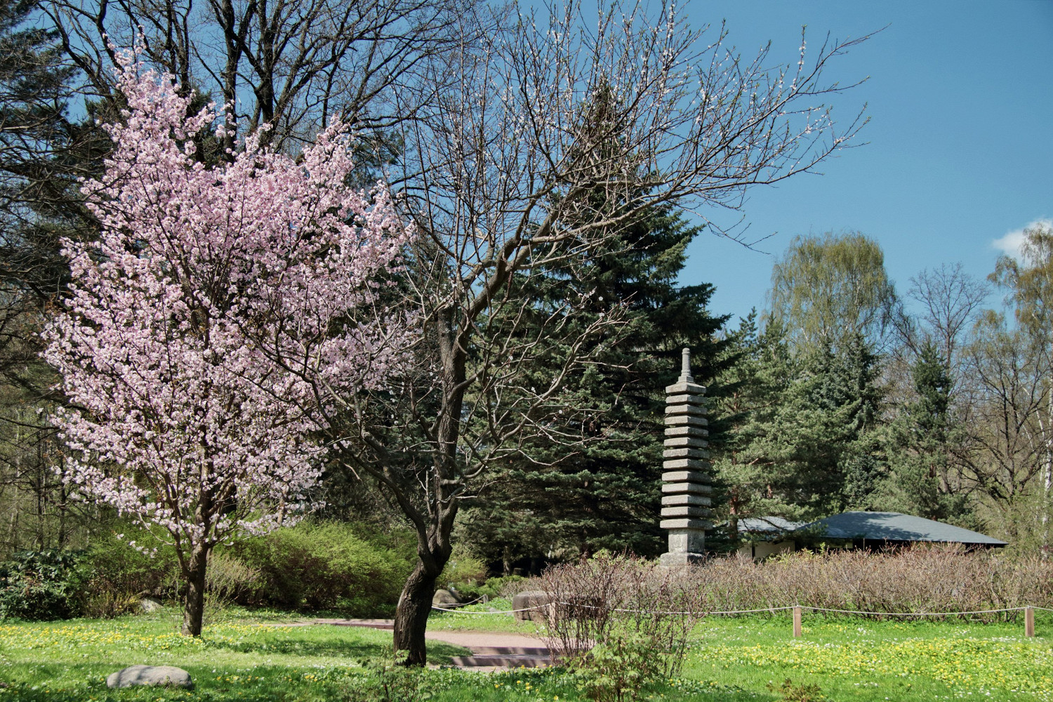 Помимо сакуры на территории площадью 2,7 гектара можно увидеть каменную пагоду XVIII века, каскад водопадов, пруды с островами, традиционные павильоны и чайный домик.