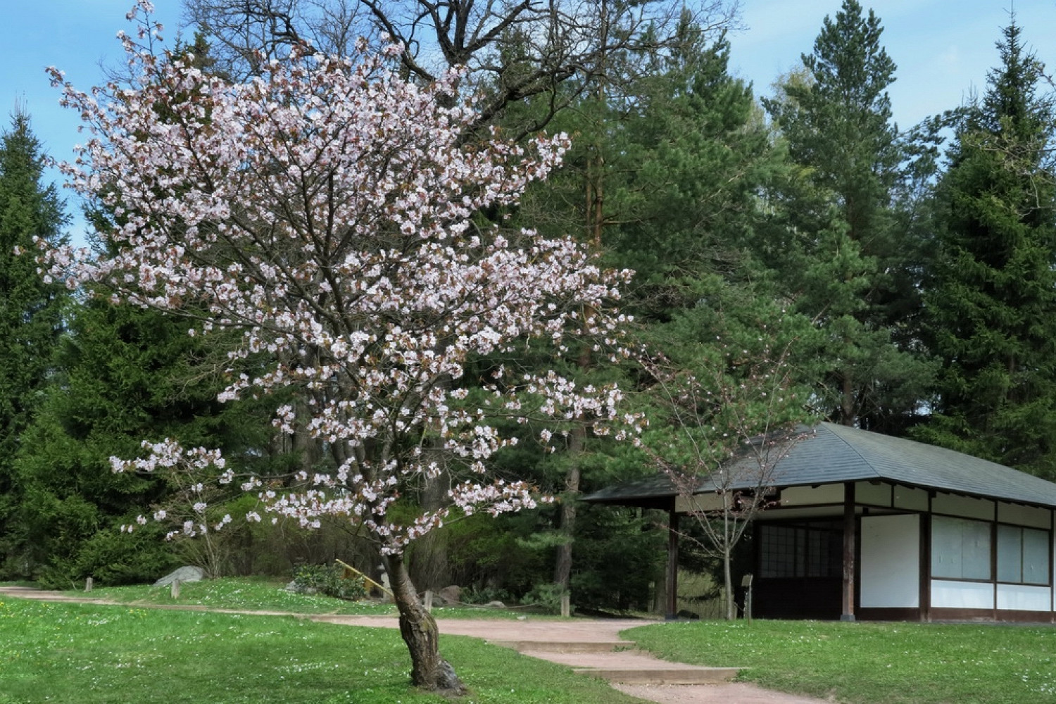Для свободного посещения сад открывается с 15 апреля. Правда, на открытой территории растет только одна сакура. Цветет она у входа на участке показа приемов декоративного оформления, недалеко от пруда (карту можно найти на сайте). Деревце небольшое, но очень симпатичное.