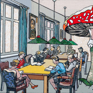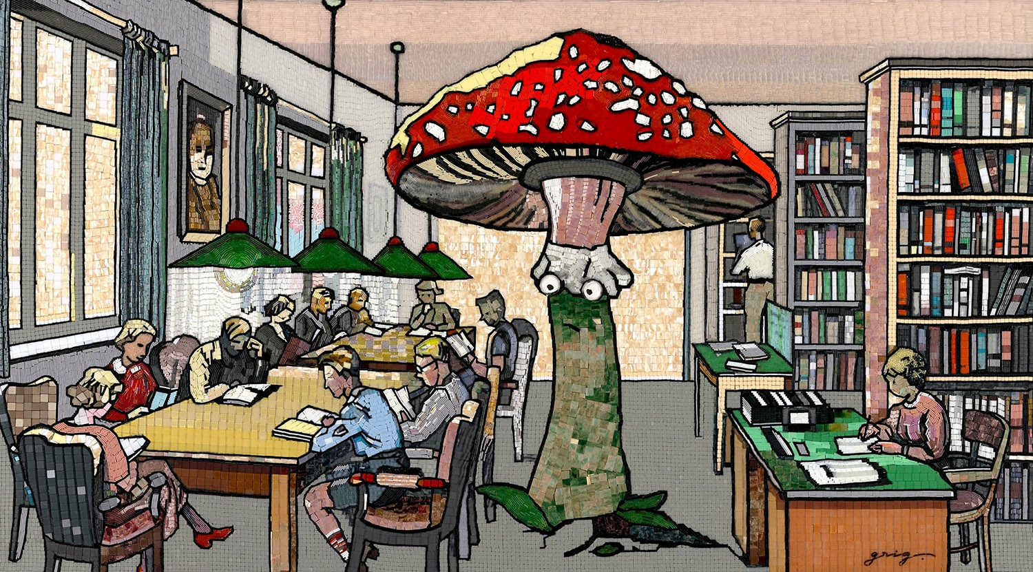 Большинство представленных работ выполнено в сложной и трудоемкой технике мозаики из стекляруса на холсте, в которой автор работает в последние годы. Мультивселенная Грига построена на визуальных алогизмах: его персонажи нарушают границы пространства и времени, путешествуя сквозь стили, эпохи, культурные пласты. Например, традиции советской книжной иллюстрации и научной фантастики сочетаются с атмосферой картин Билибина и Васнецова. А герои русских сказок соседствуют с протагонистами из комиксов.