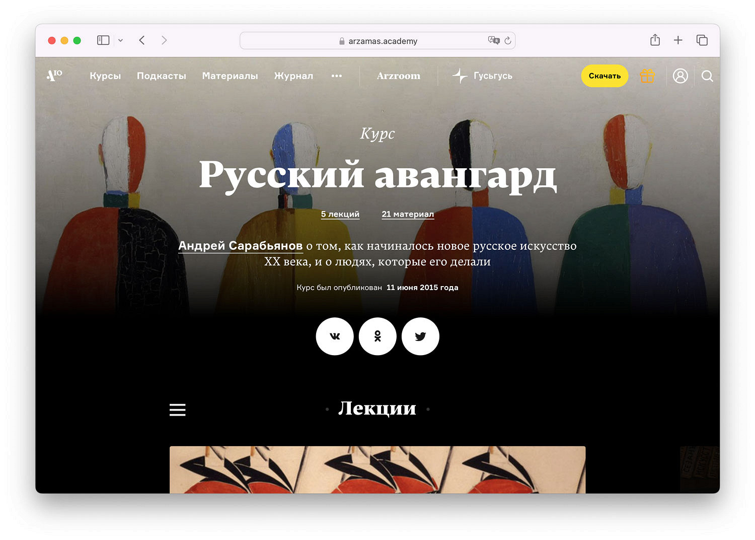 Просветительский проект выпустил цикл коротких лекций одного из ведущих исследователей авангарда Андрея Сарабьянова. А в рамках подкаста «Зачем я это увидел?» стоит поискать выпуски с искусствоведом Галиной Ельшевской, приуроченные к выставкам.