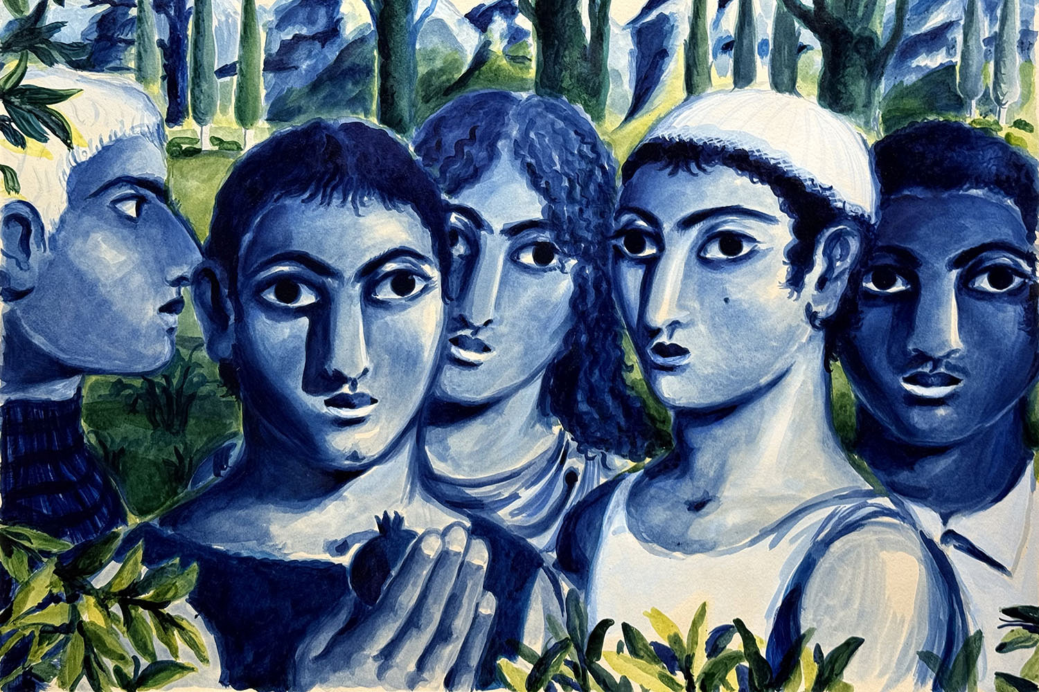 В числе самых интересных лотов — новая картина Ахмата Биканова «В саду». Молодой человек вырос в Кабардино-Балкарии и обращается за вдохновением к национальной культуре. Кроме того, у автора необычная техника: он наносит акварель на бумагу так, чтобы за каждым новым слоем оставался виден предыдущий. У зрителя есть возможность изучить весь процесс работы художника, включая и совершенные им ошибки.