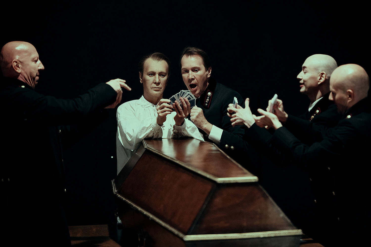 На сцене все просто и страшно одновременно. В обезличенный зал для прощания с усопшим вносят гроб, в нем лежит главный герой. Через некоторое время он оттуда «восстает», оставляя вместо себя двойника с восковой маской на лице (второго Ивана Ильича играет Леонид Тимцуник). Давний адепт темы двойничества в искусстве, Валерий Фокин таким образом решает сразу две задачи: визуализации процесса выхода души из тела и отстранения героя от своей прежней жизни.