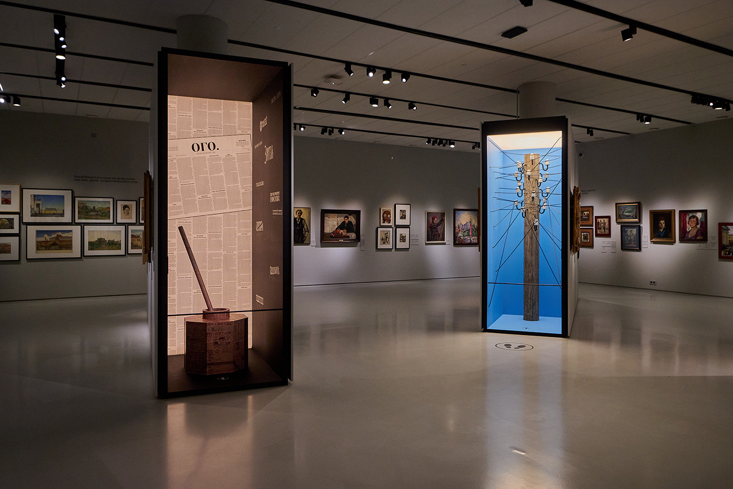 На зрительское впечатление сильнее всего работают висящие встык портрет писателя работы Сергея Малютина и абстрактная «Москва. Синтетический город» Александры Экстер. Разница в написании картин — год, и это идеальная иллюстрация к тому, какими непохожими путями шло отечественное искусство сто лет назад.
