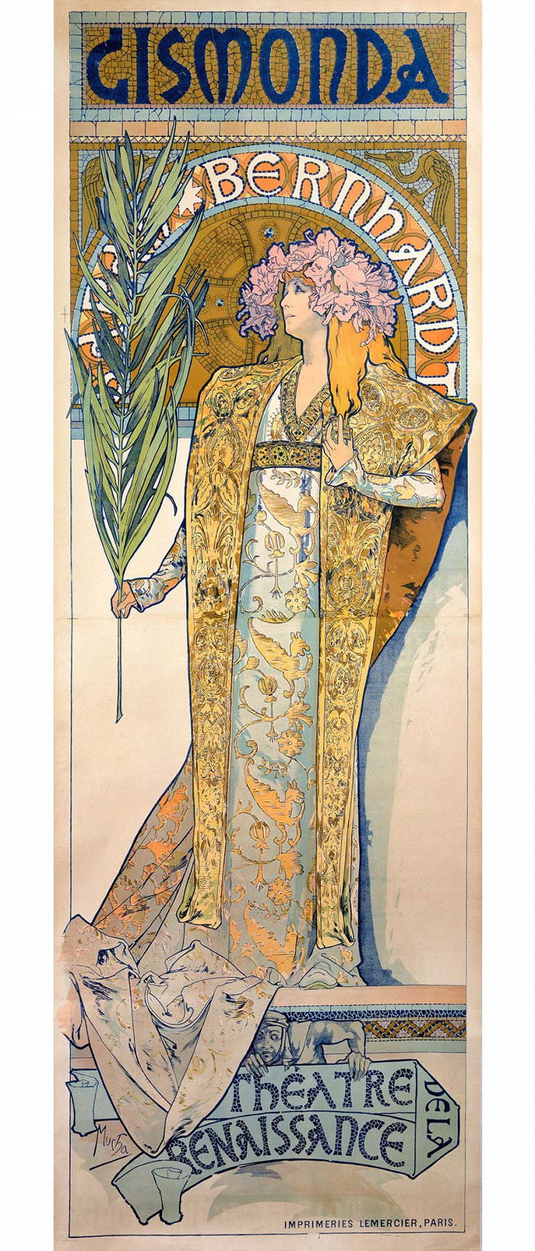 Под Рождество 1894 года все именитые парижские художники были заняты, а Саре Бернар — главной звезде французской сцены, — как назло, срочно понадобился плакат для объявления о продления спектакля «Жисмонда» в Театре Возрождения. Пришлось обратиться к не слишком известному чешскому эмигранту, Альфонсу Мухе, который перебивался иллюстрациями для журналов.
