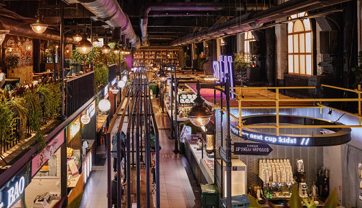 Здесь особенность — система единого чека: заказ нужно делать не возле кассы того или иного кафе, а у официанта, который работает в зале, — по сути, как в ресторане. Систему создали IT-специалисты: гости выбирают еду и напитки из общего меню, где представлены все проекты, а система сама рассылает заказ по фуд-корту. Сейчас на территории фуд-маркета работает 15 площадок: The Botteganova (паста и брускетты), вьетнамцы Ngon, Poke House, греческое кафе Sito, Avocado Point, Pizza Rim, грузинский проект «Батони», «Мясной цех», где охлажденное мясо из Пятигорска продают на вынос, «Краб всему голова» — рыбное заведение Zemskiy Group, «Испанская лавка», кондитерская «Москва–Париж», представленная на Streat, Fresh Light Bar, t — дочерняя кофейня Camera Obscura, пивной Olsterʼs Pub. До конца года их количество увеличится до 20.