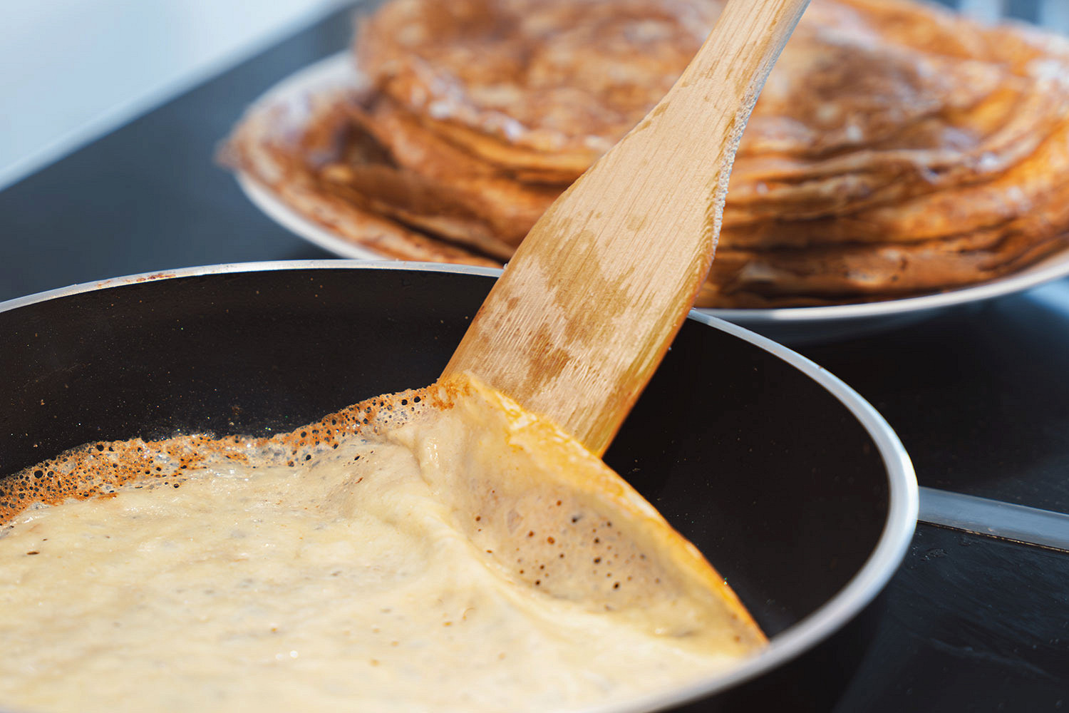 «Ключевые компоненты теста для классических блинов — мука, яйца, молоко, растительное масло, сахар и соль. Молоко подойдет почти любое, но лучше использовать пастеризованное коровье 3,2–4%-ной жирности (продается обычно в бутылках), а не ультрапастеризованное (в пакетах). Иногда молоко рекомендуют смешивать с водой в разных пропорциях. Я так не делаю, всегда готовлю тесто только на молоке. Для тонких бездрожжевых блинов оно не должно быть теплым или горячим, можно использовать даже холодное. Кстати, сделать блинное тесто можно и на любом растительном молоке: миндальном, кокосовом, овсяном, рисовом.