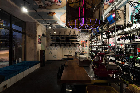 Если хочется бутерброда с колбасой и вина, вам непременно именно в этот бар. Полки забиты образцами от частных виноделен. Бокалы подписывают именами гостей, чтобы никто случайно не выпил чужой петнат, а на кухне собирают идеальные закуски: бутеры с докторской колбасой (340 р.), нарезку салями (280 р.) и сет из артишоков, вяленых томатов и оливок (390 р.).