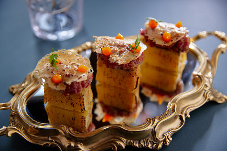 За кухню отвечает молодой шеф Глеб Гайгер («Поколение»). В меню — ироничные твисты на популярные блюда: «Сосиска в тесте а-ля „Веллингтон“», суп «Дошик по-буржуйски с уткой», «Котлета а-ля рюс с двумя видами икры, фуа-гра и соусом шампань». Тартар из говядины на картофельном гратене и бриошь с маринованными желтками подают на нарядном зеркальном блюде. Еда получилась красивая по подаче, необычная в плане сочетания продуктов, но пока не всегда дотягивает по вкусу. Да и порции маленькие — разделить блюдо с компанией не получится.