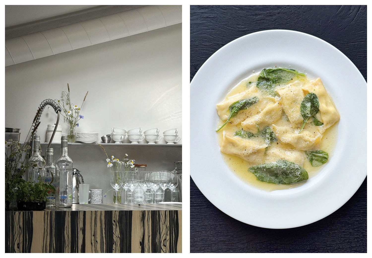 В основном меню собраны компактные закуски вроде паштета с фуа-гра и томатным чатни или карпаччо из томатов с домашней рикоттой. Есть и горячие блюда с отсылками к французской кулинарной традиции: фермерский цыпленок с картофельным пюре, запеченная черная треска, паста с креветками и боттаргой или щучья котлета с орзо.