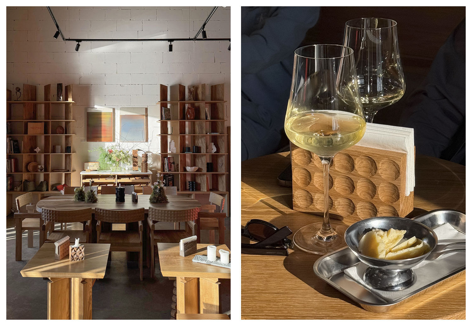 Заодно магазин работает как кофейня и винный бар. Варят хороший капучино, наливают фильтр, а в компактной карте собраны вполне удобные классические позиции по бокалам. К ним можно заказать закуски вроде фиников и оливок, хлеб с маслом и другие приятные мелочи к вину. Атмосфера максимально расслабленная и камерная.