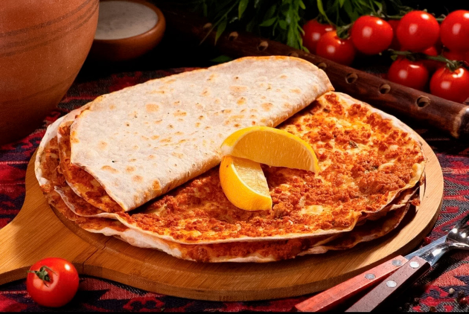 Ламаджо — армянская версия пиццы: на тонком тесте, с большим количества мяса и специй в начинке. Порции обычно большие, тем не менее тонкий ламаджо удобно сворачивать в трубочку и есть даже на ходу. В Москве блюдо подают почти во всех армянских ресторанах (дело принципа!) и небольших кафешках.