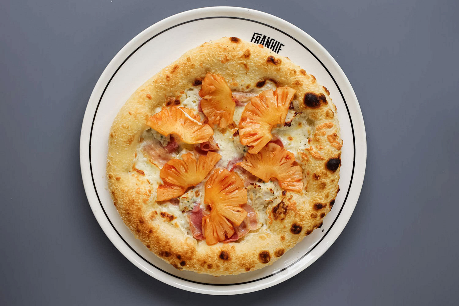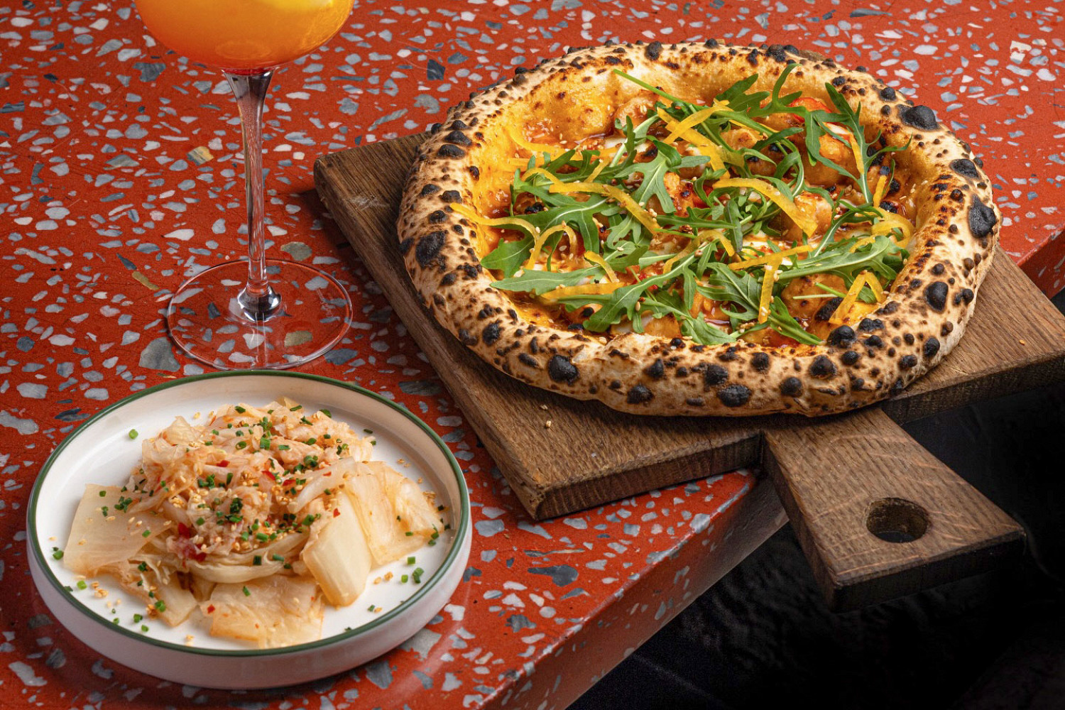 В меню — салат «Цезарь» (отличный, к слову!), аранчини с трюфелем, тартар, несколько горячих блюд вроде стейка «Нью-Йорк» и большой раздел с пиццей. Она здесь достаточно компактная — можно справиться в одиночку — с пухлыми пятнистыми бортами (бруклинский стиль) и любопытными начинками. Есть острая со спьянатой и соусом лао ган ма; пицца с кимчи и моцареллой; с луковым джемом и бри; с пастрами и пикулями или ананасом кимчи и тамбовским окороком. К авторским версиями прибилась парочка более-менее классических сочетаний: отличная «Маргарита», острая с пепперони, страчателла с анчоусами или рукола, прошутто и карамелизированные персики.