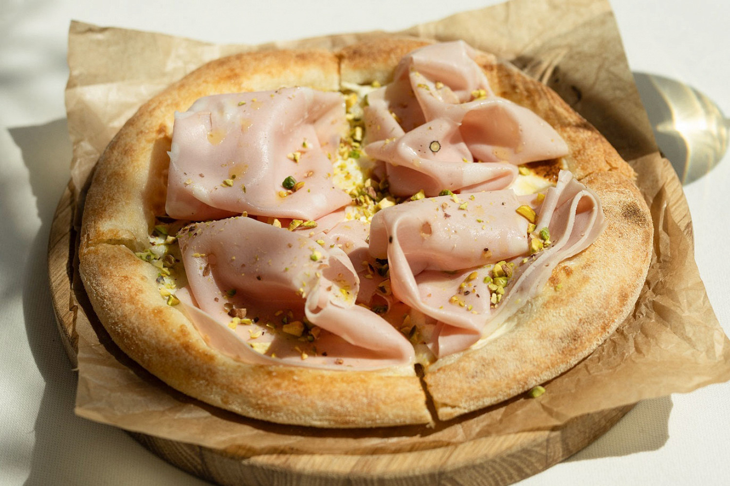 Сама пицца компактная, на тонком тесте, с приятными мягкими корочками. Сочетания — консервативно-итальянские, без экспериментов: «Маргарита», «Четыре сыра», «Мортаделла с фисташками», «Артишоки и пармская ветчина» или «Ветчина и грибы». Самая экспериментальная — пожалуй, лосось с черной икрой (такая итало-русская дружба) за 7500 рублей.