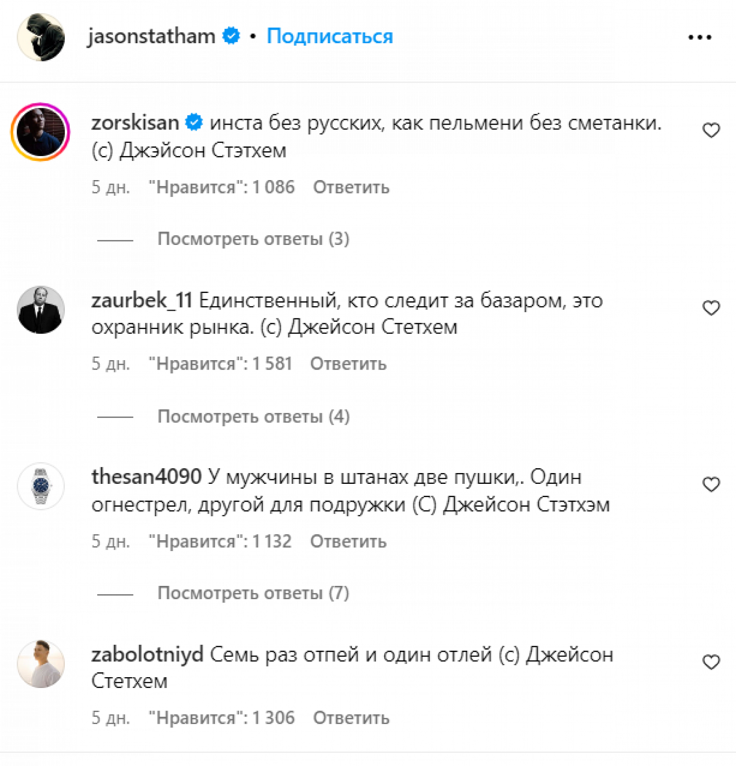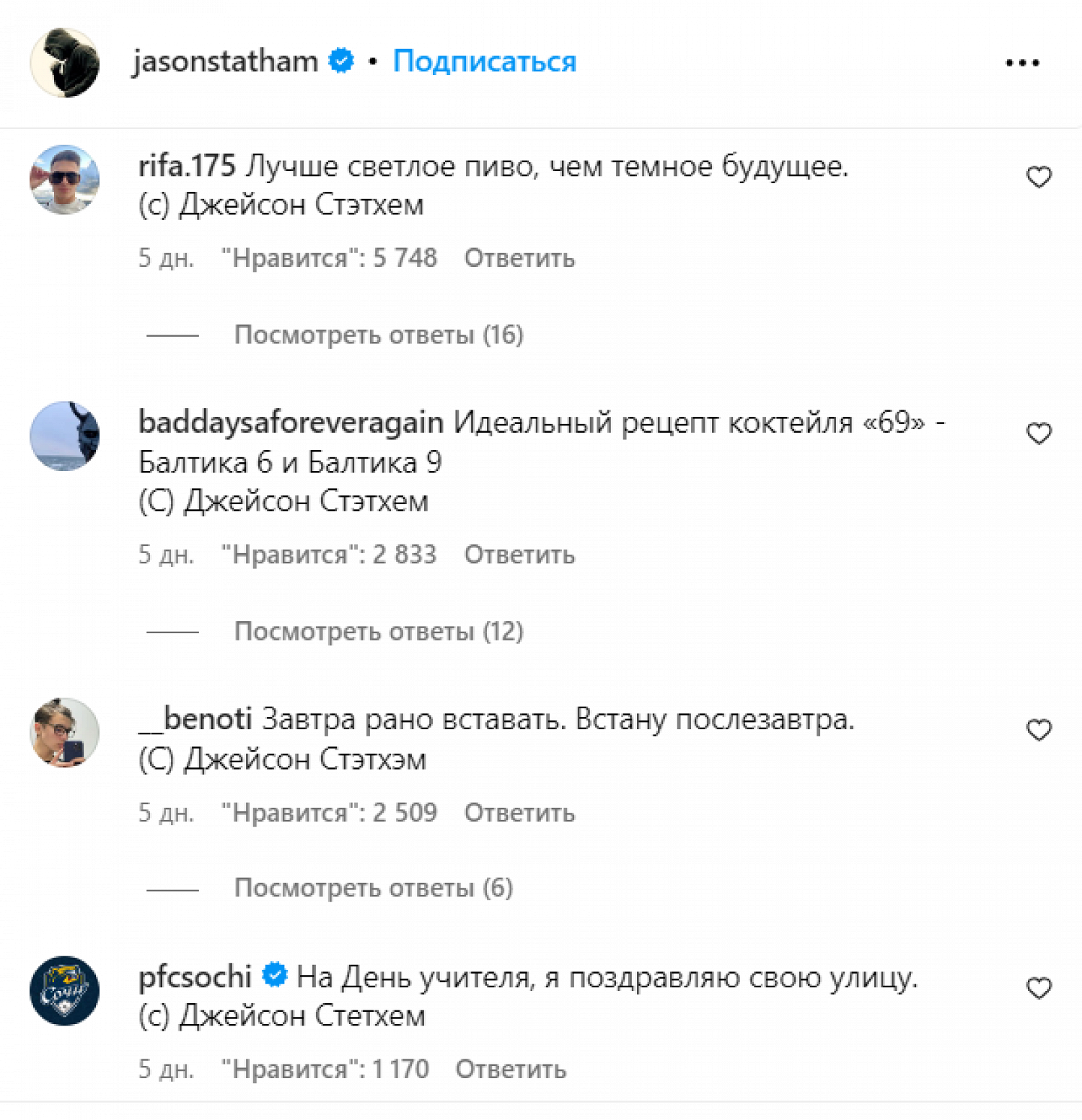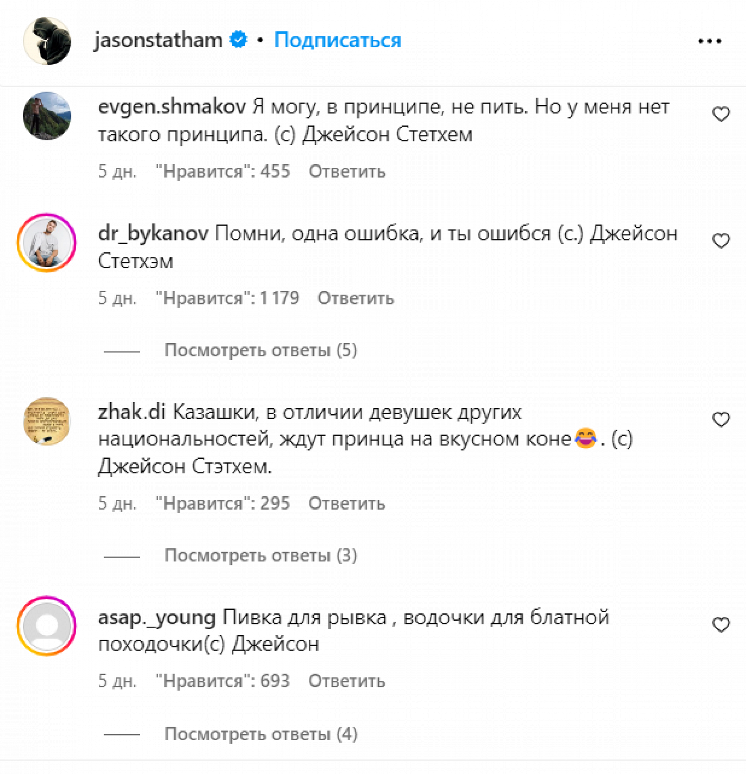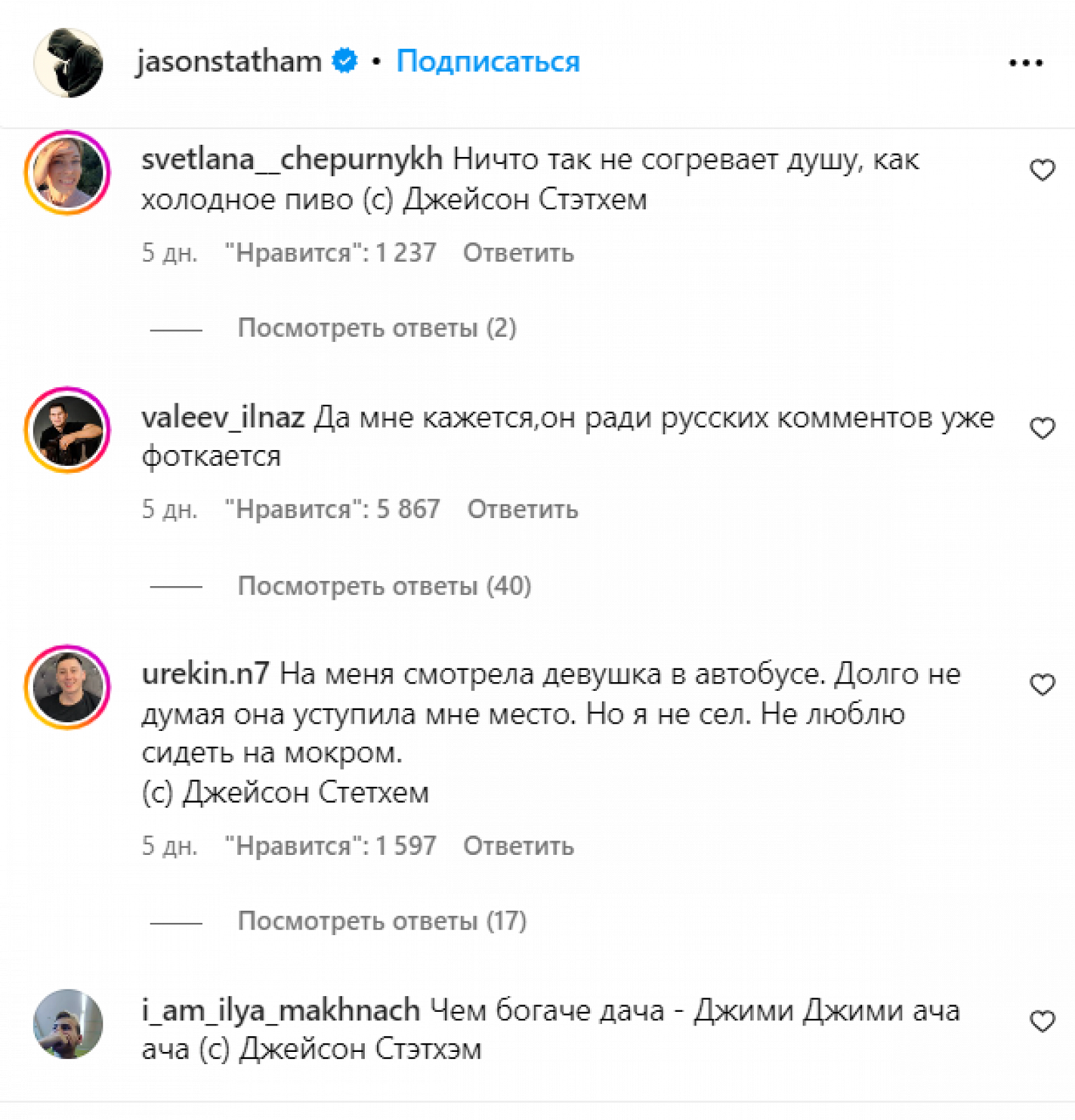 Фотография, на которой звезды будто сидят на рыбалке и обсуждают личные вещи, появилась в инстаграме* Стэтема пять дней назад. За это время она успела набрать более 909 тыс. лайков и сотни комментариев, большая часть которых — русскоязычные, оформленные как выдуманные цитаты Стэтема из «пацанского» паблика в «ВК».