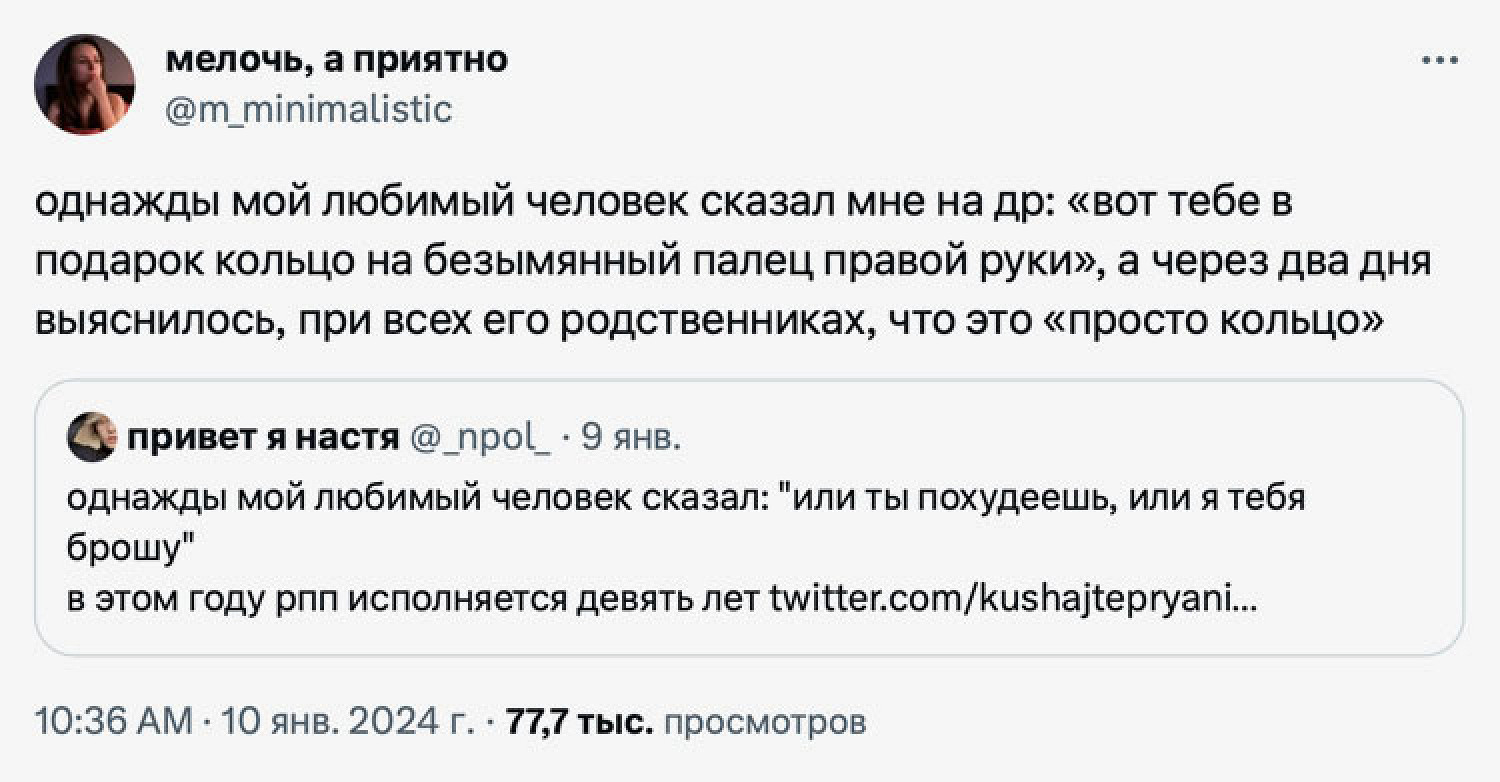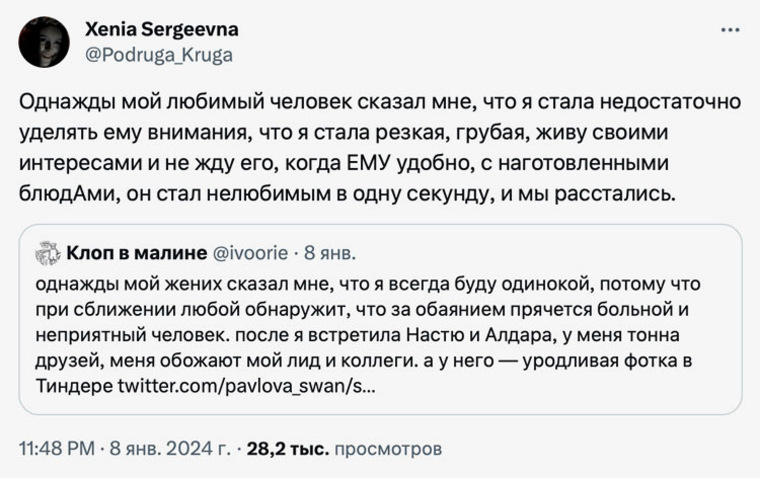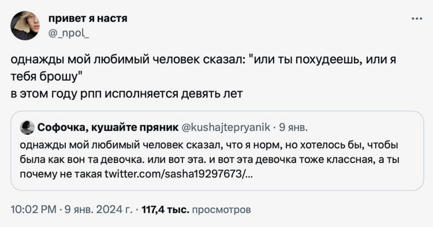Некоторые истории похожи на примеры абьюзивных отношений: человек сначала входит в доверие, а потом начинает унижать и критиковать партнера или партнершу. Оскорбления, запреты, постоянная критика, обесценивание чувств и принижение достижений входит в понятие психологического насилия. Например, фразу «или ты похудеешь, или я тебя брошу», упомянутую в твите девушки, которая уже девять лет после этого страдает от расстройства пищевого поведения, можно отнести к манипуляции. Подробнее про виды насилия и способы ему противодействовать можно прочитать в этой памятке «Афиши Daily».