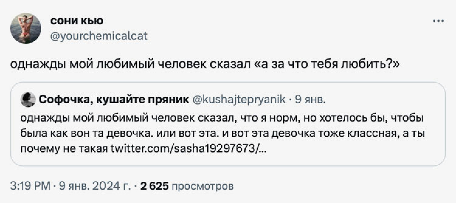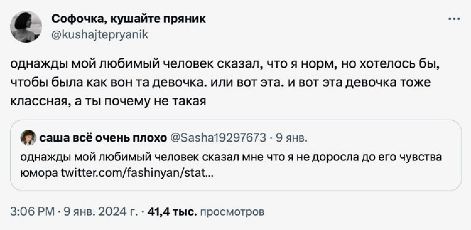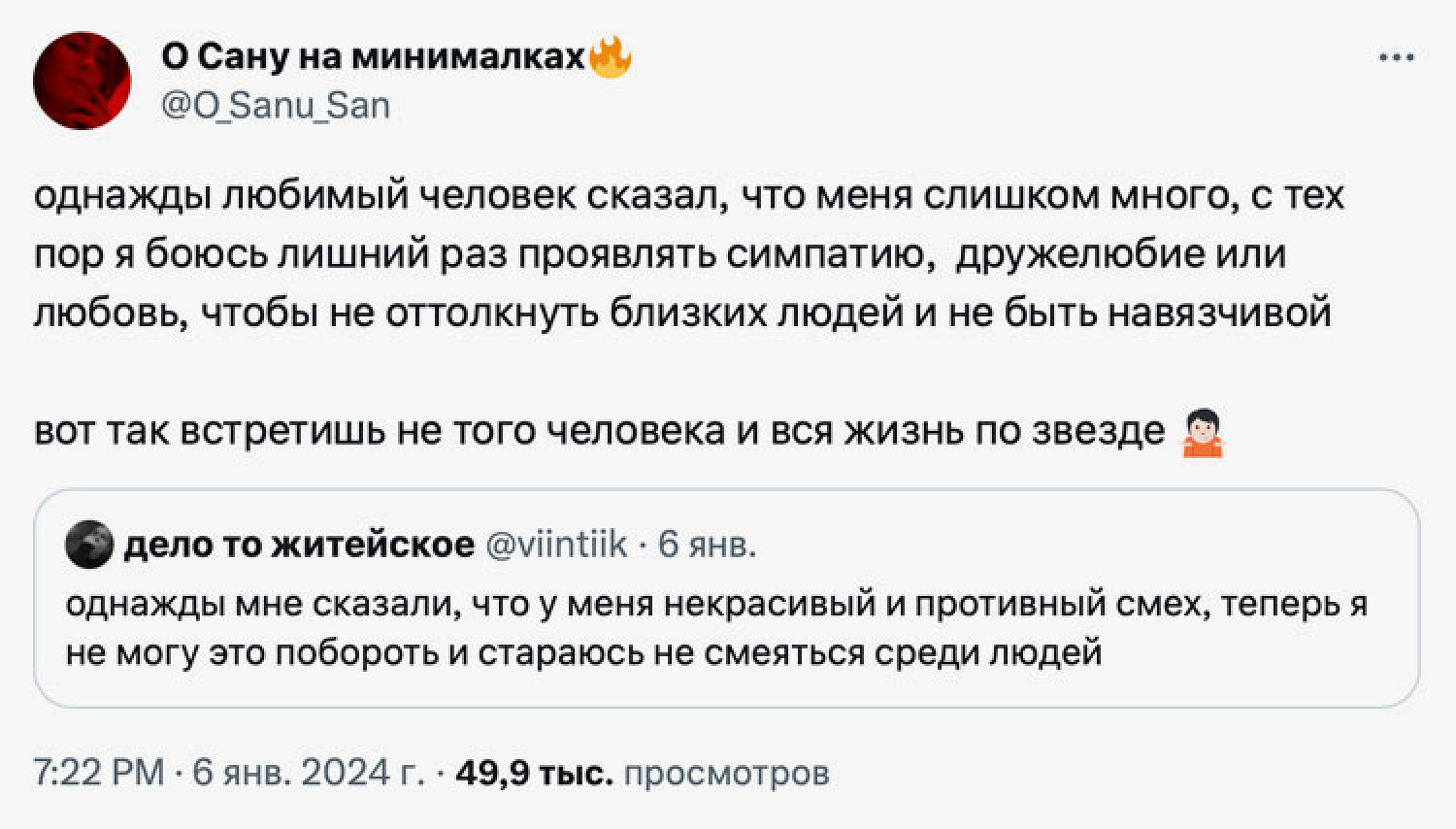 Пользовательница твиттера @viintiik поделилась, что однажды ей сказали, что у нее «некрасивый и противный смех» — из‑за этого у девушки сформировался комплекс и она до сих пор старается не смеяться в присутствии других людей. Следующий реплай был связан с тем же неприятием себя, но на этот раз в результате слов любимого человека. Теперь комментаторы делятся своими личными историями, начиная твит с фразы «Однажды мой любимый человек сказал».