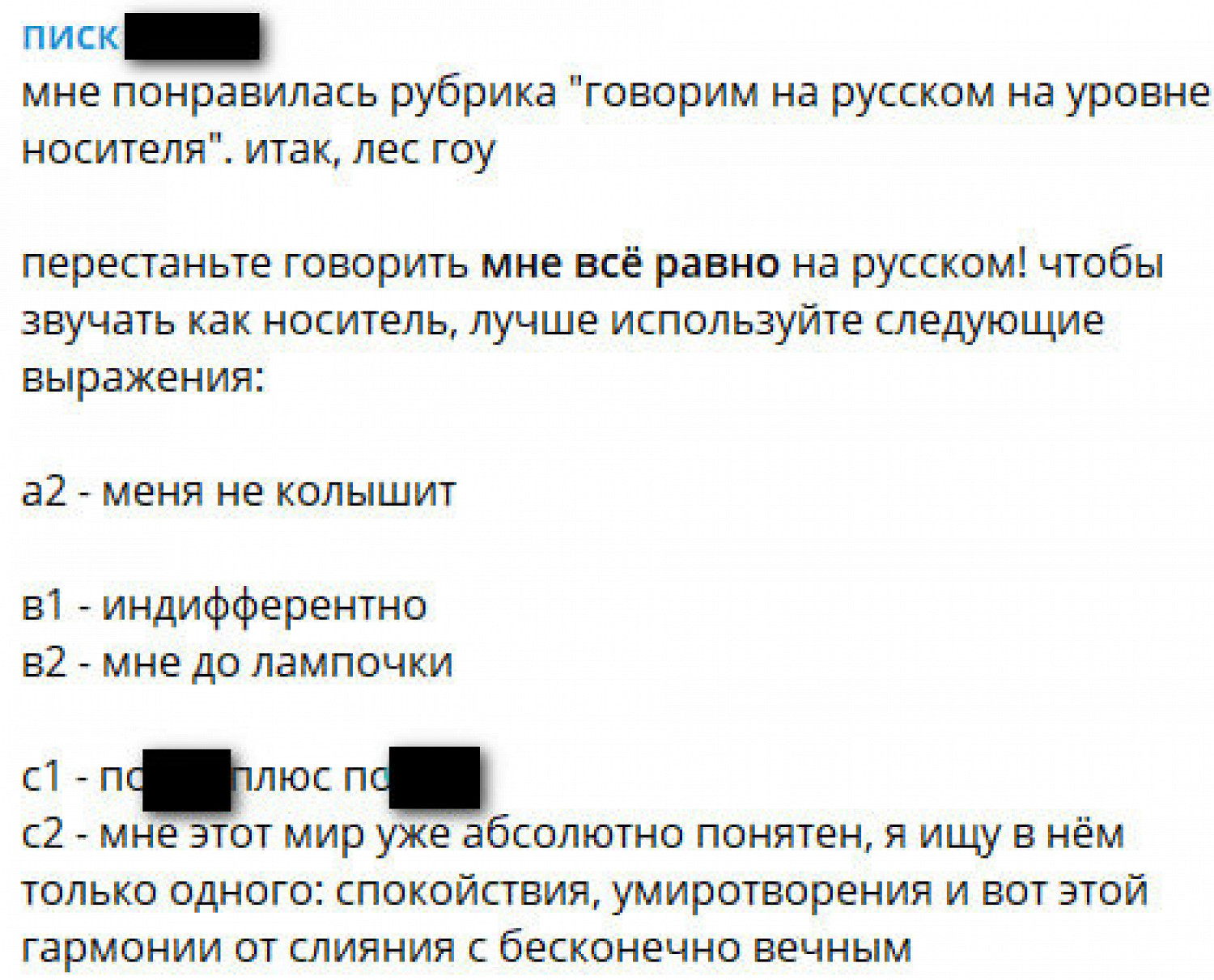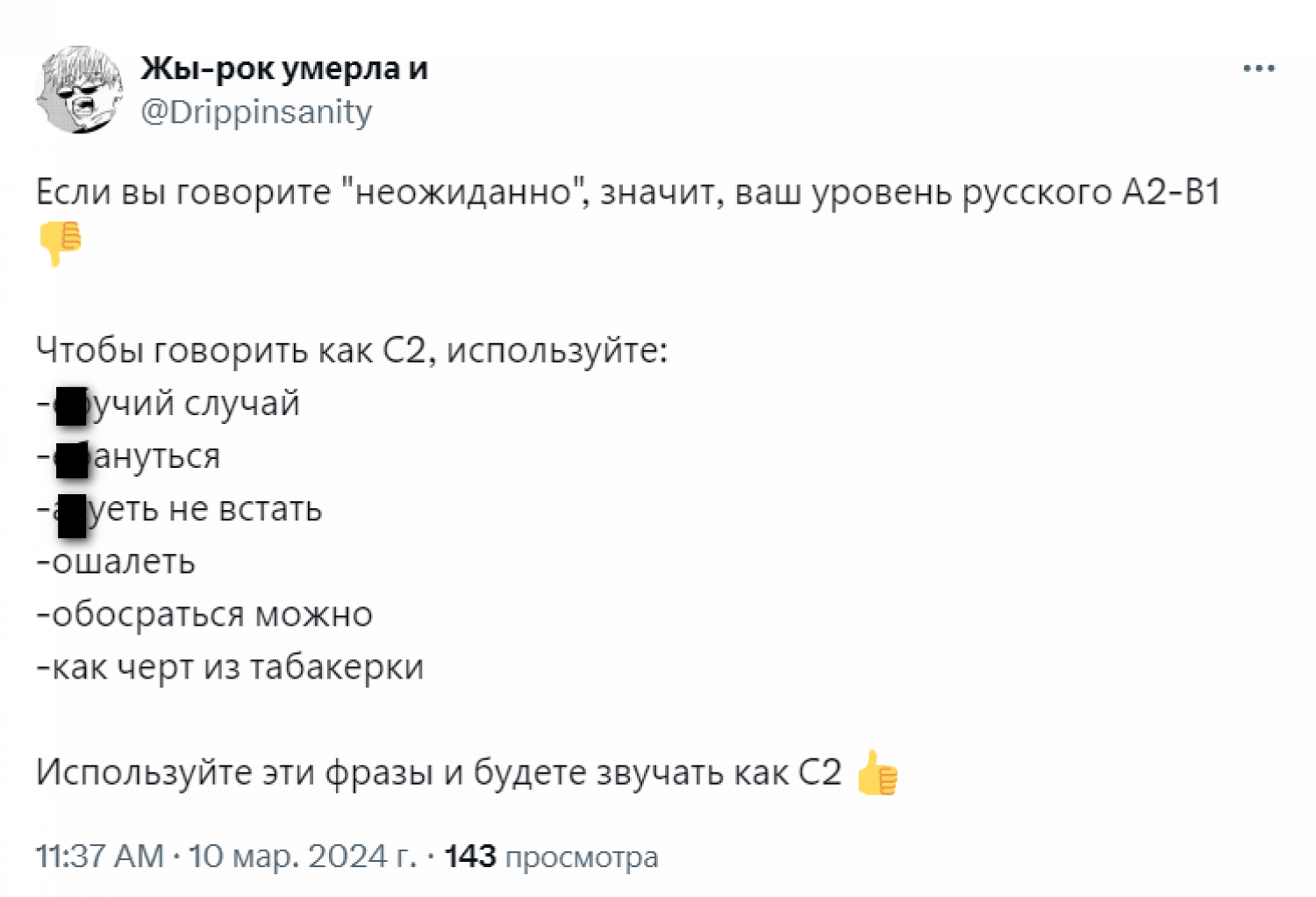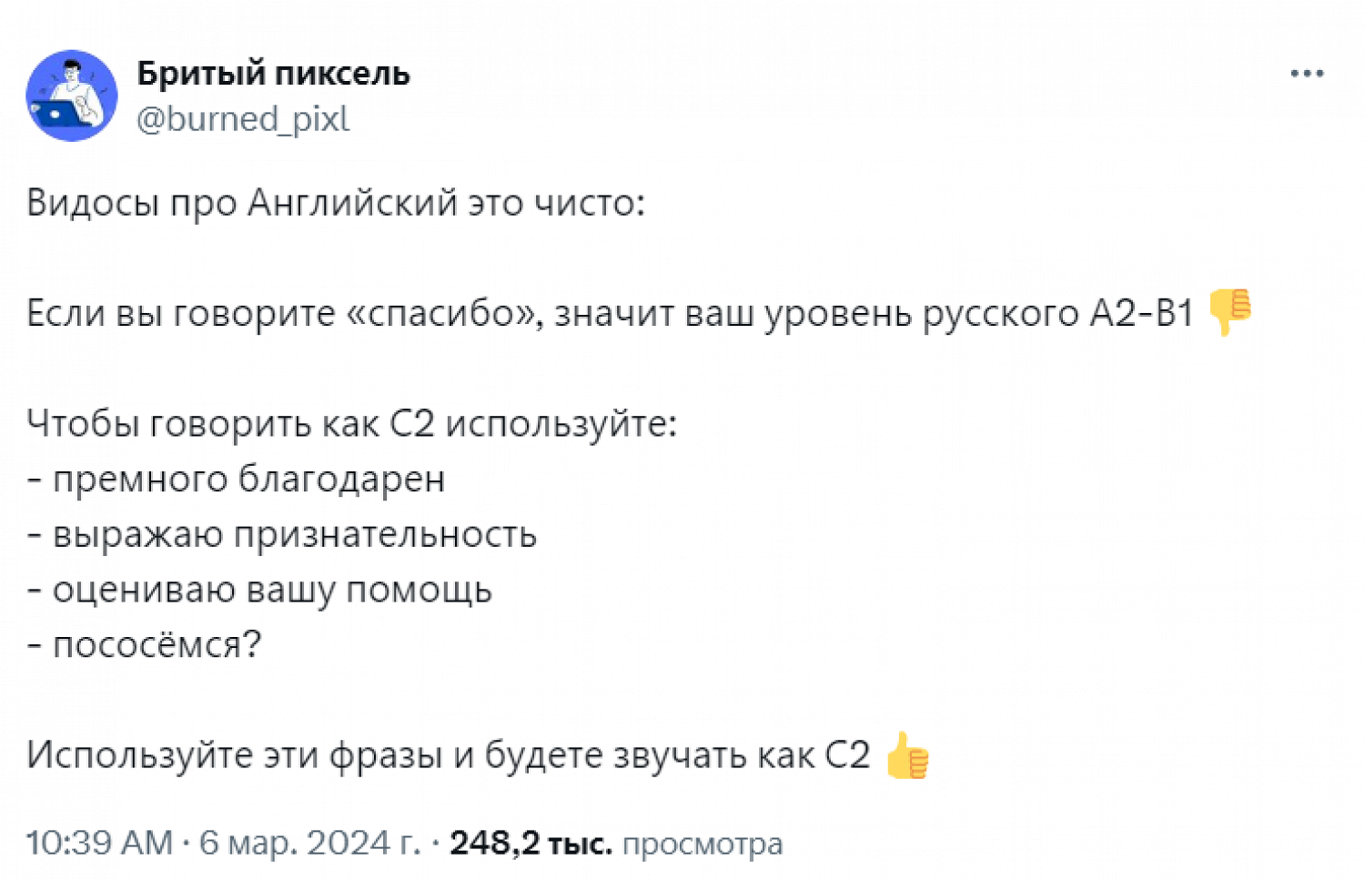 Чаще всего такие посты начинаются с фразы: «Если вы говорите X (какое‑то простое слово), то ваш уровень русского А1». К примеру, по мнению пользователей, чтобы поднять русский до C2 вместо «спасибо» стоит говорить «премного благодарен» или «пососемся?».