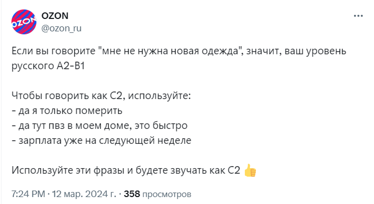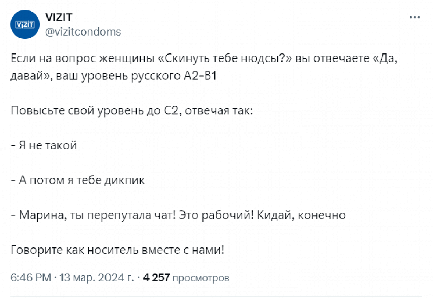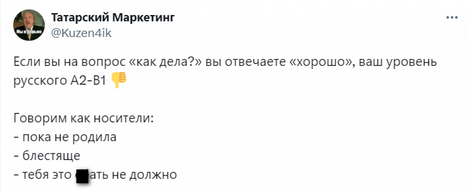 Чаще всего такие посты начинаются с фразы: «Если вы говорите X (какое‑то простое слово), то ваш уровень русского А1». К примеру, по мнению пользователей, чтобы поднять русский до C2 вместо «спасибо» стоит говорить «премного благодарен» или «пососемся?».