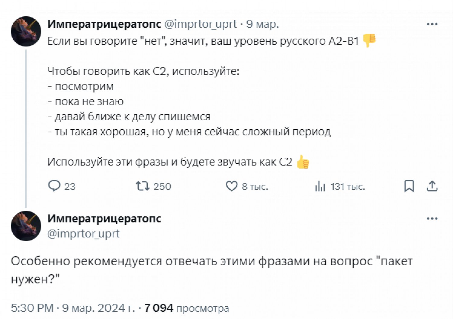 Однако многие пользователи считают, что в реальной жизни такая речь будет звучать неестественно и смешно. Чтобы проиллюстрировать это, они начали постить пародийные советы — как улучшить ваш русский с уровня A1 до C2.
