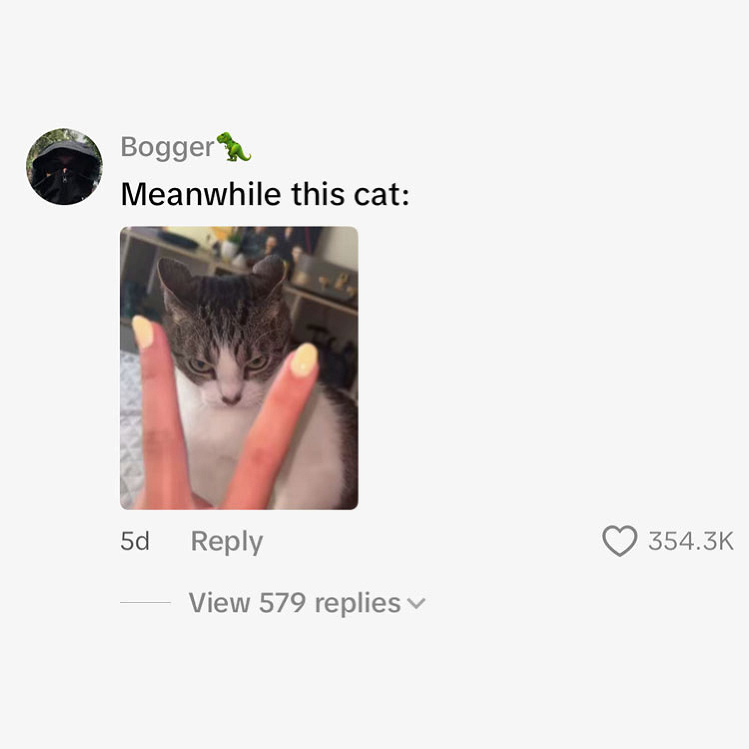 «Собаки в этом тренде: 🥰😊😘😍😚❤️💕. Кошки в этом тренде: 🤨💢💣❤️🔥👹💥🫦🧟♂️», — написала в комментариях @niku_nika.