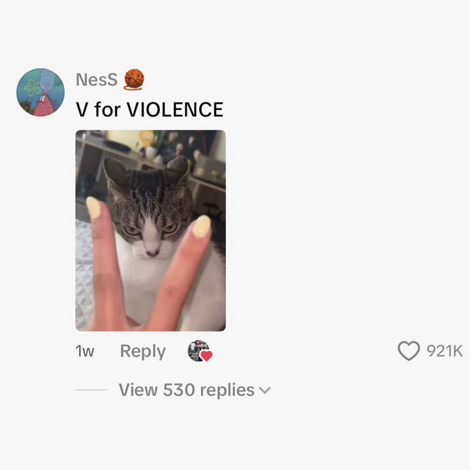 В тиктоке новый очаровательный тренд: под романтичную песню «L-o-v-e» в исполнении американского певца Майкла Бубле пользователи руками показывают своим котикам буквы из названия трека, проверяя, на какую из них питомцы нападут. Однако, как это и бывает с котами, все идет не по плану с самого начала: коты воспринимают руку как угрозу и грызут своих хозяев с первых секунд. Одно из таких видео, опубликованное пользовательницей @carolorto, набрало 35 млн просмотров.