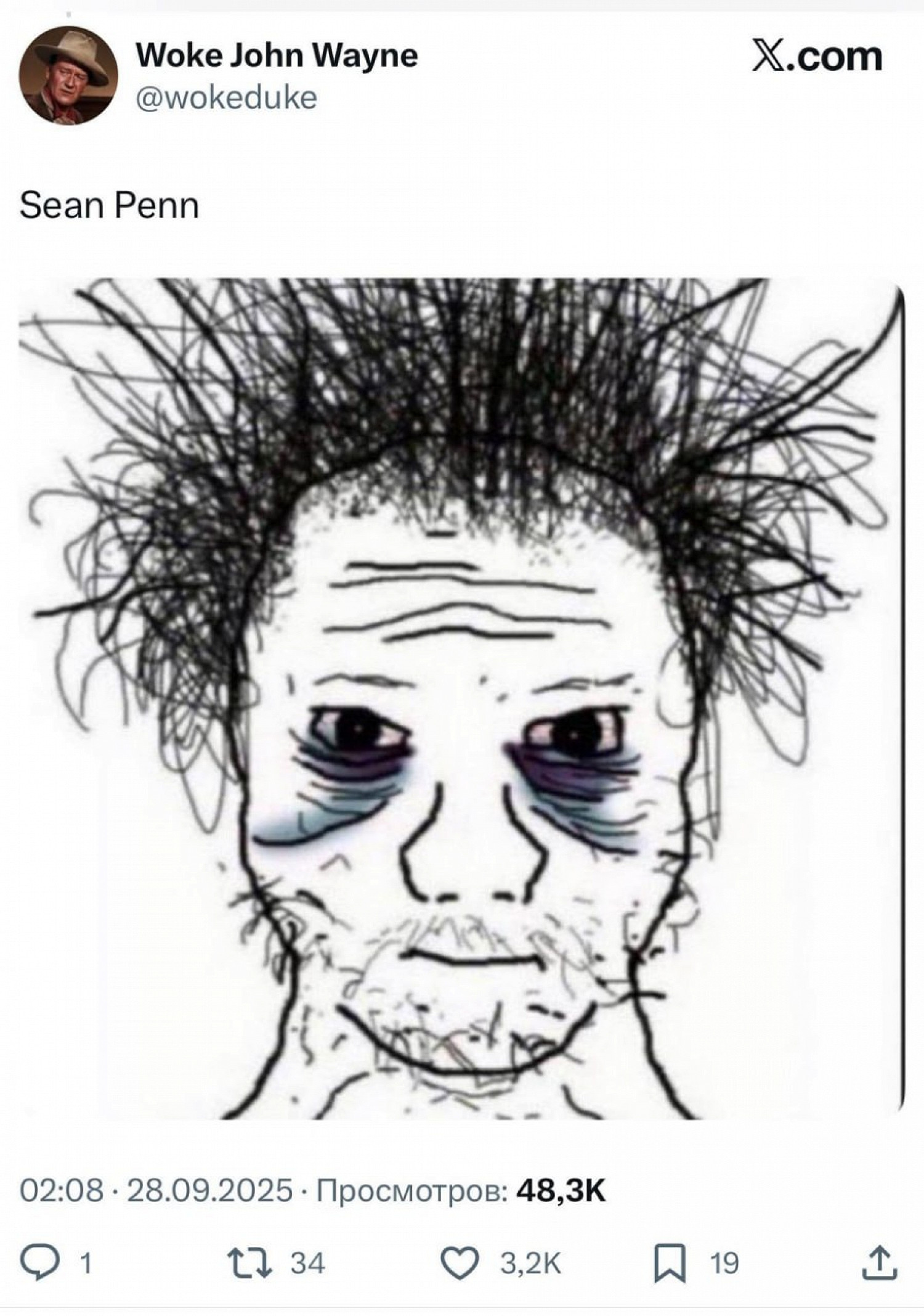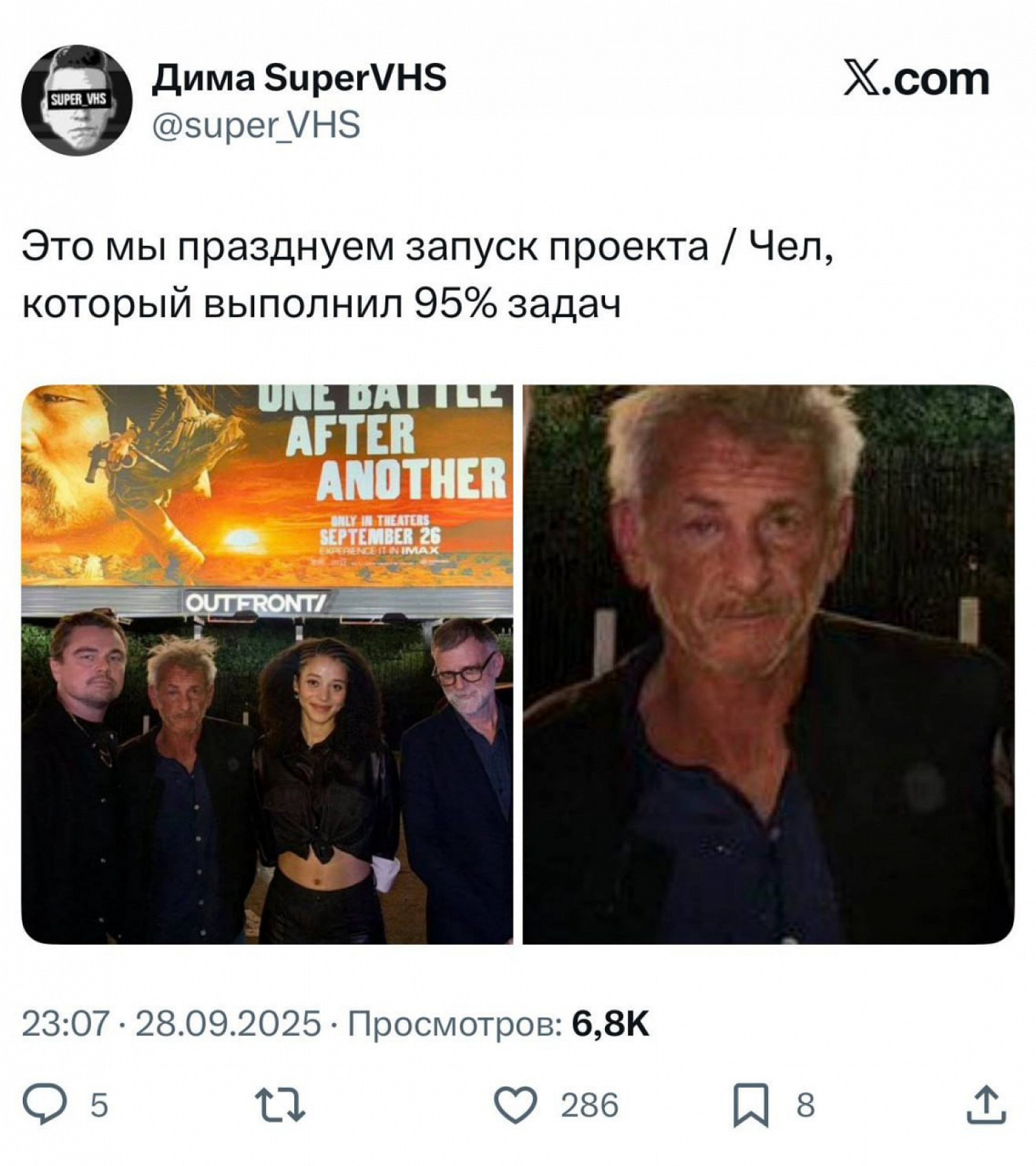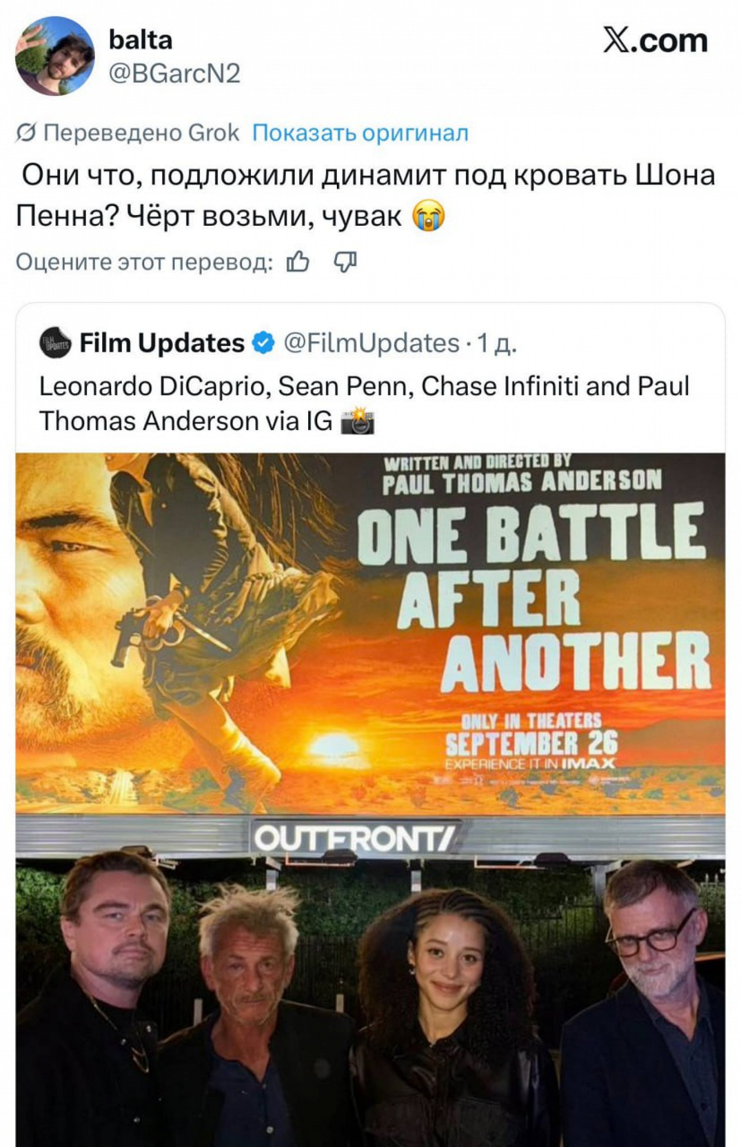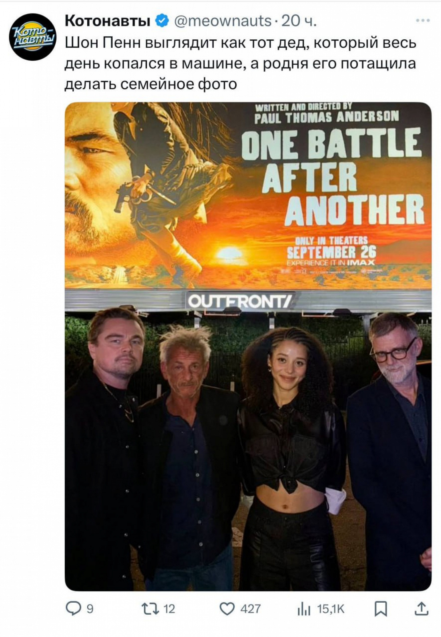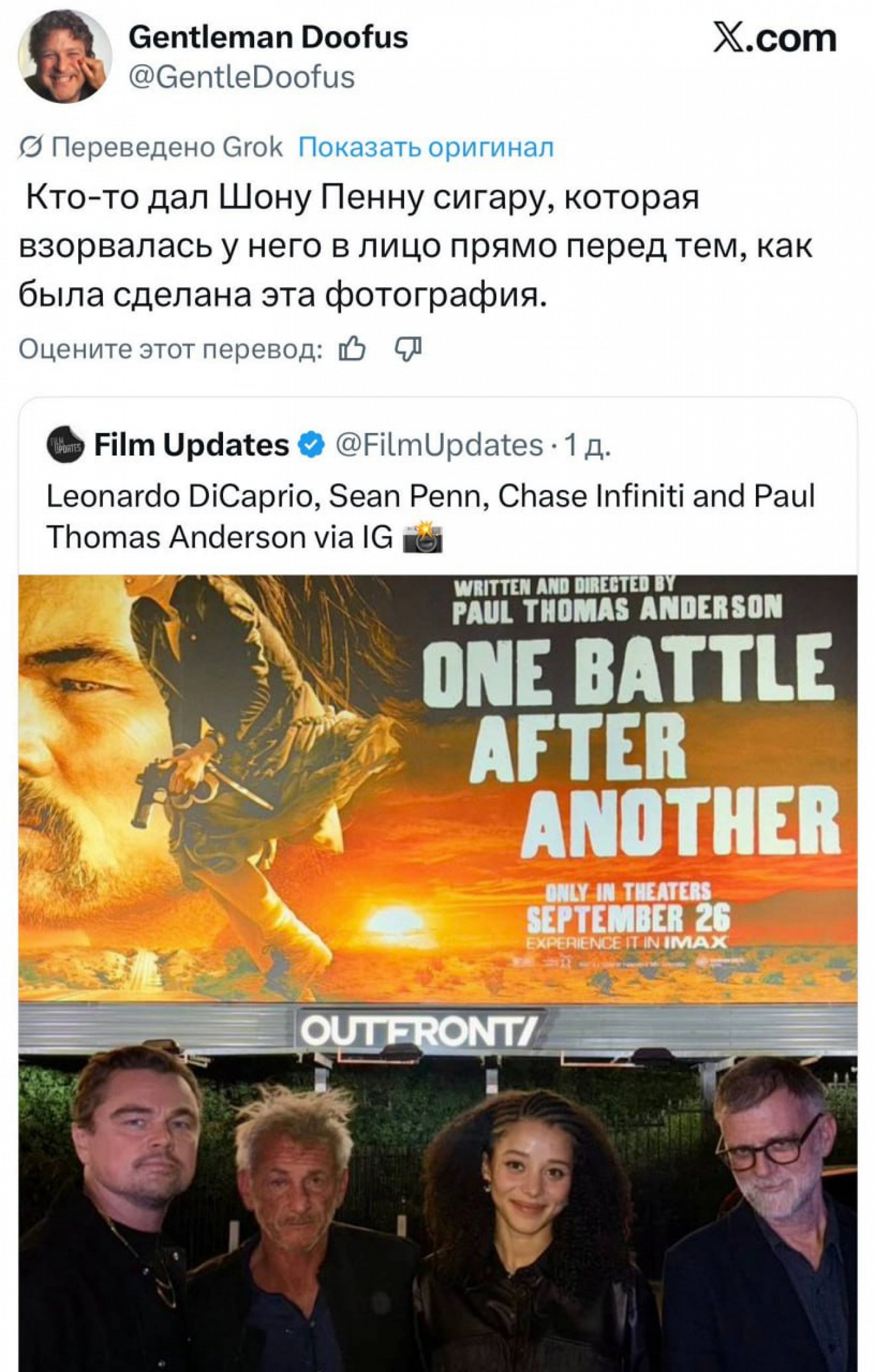 На лондонской премьере экшн-эпоса «Битва за битвой» внимание публики неожиданно украл не Леонардо Ди Каприо, а Шон Пенн. Все благодаря его эффектному внешнему виду, который тут же разлетелся на мемы.