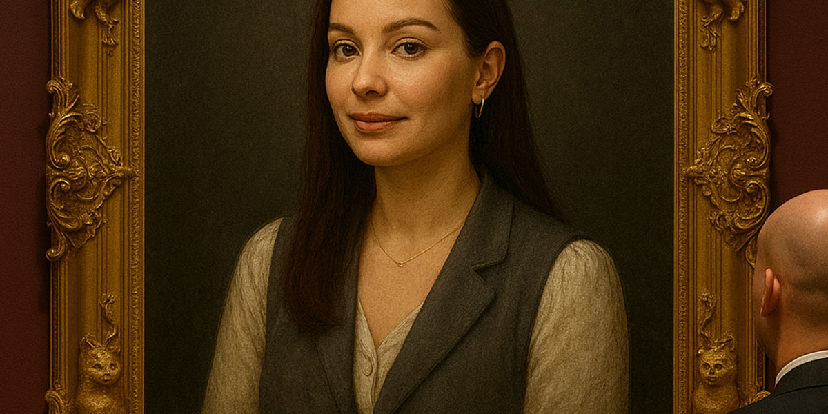 Для получения идеального результата советуем вводить промпт по-английски — так нейросеть будет работать точнее. Прикрепите фотографию и добавьте следующий текст: «A modern art gallery. The space is dimly lit, with the only light coming from track lighting on the ceiling, illuminating a large, expressive oil portrait of a girl on a clean burgundy wall (use her face and appearance, keep features unchanged). Soft lighting highlights the textured brushstrokes in muted tones. In front of the painting, her man sits in a dark green armchair, shown from behind».