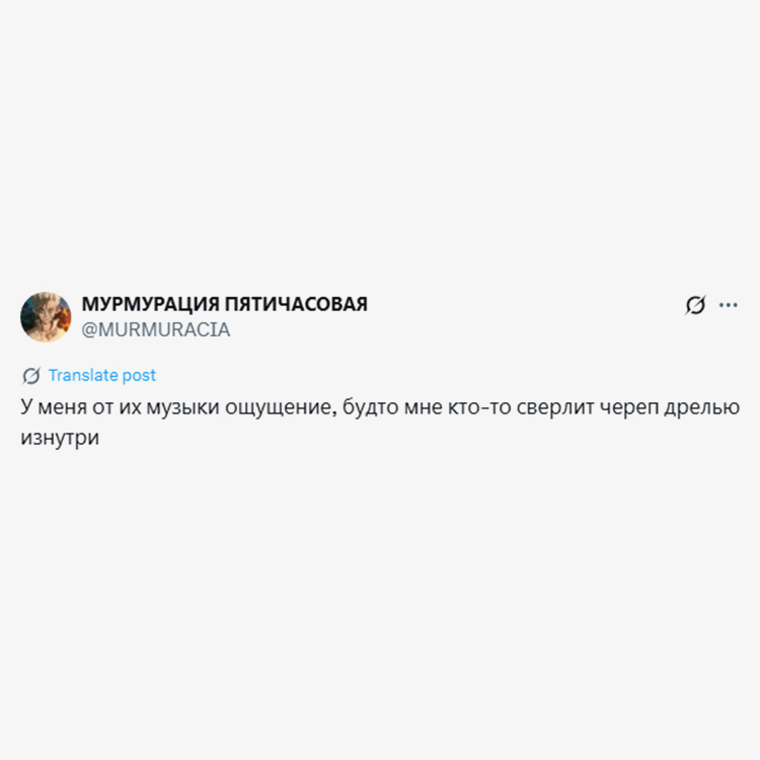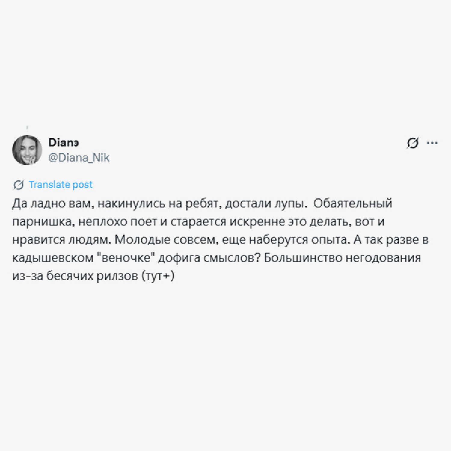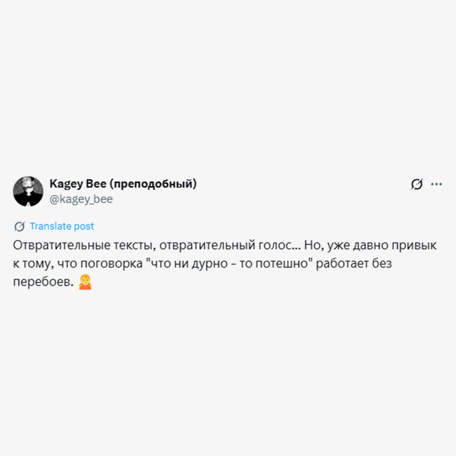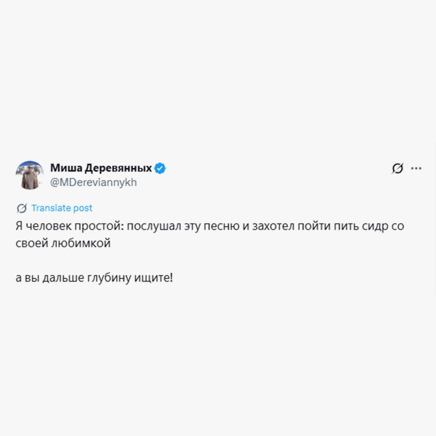 Думаю, у некоторых еще со времен „Кухонь“ накопилось негодование к группе как минимум из‑за вездесущности песни. И вот вам легитимный повод пожурить, немного обесценить их победу. А многие вполне искренне считают их тексты и общий подход пафосным, неискренним. Мне „Кухни“ понравились. „Сидр“ не очень (а мотив заел). Кто‑то видит кринжем фит Марго с Пампом, кто‑то — „Бесов“ Айсгергерта, кто‑то — новый альбом Дорна, а кто‑то — „Бонд“. Я за то, чтобы иметь право считать что угодно и кринжем, и шедевром. Только пожалуйста, без навязывания, снобизма и уж тем более попытки пристыдить кого‑то за вкусы».