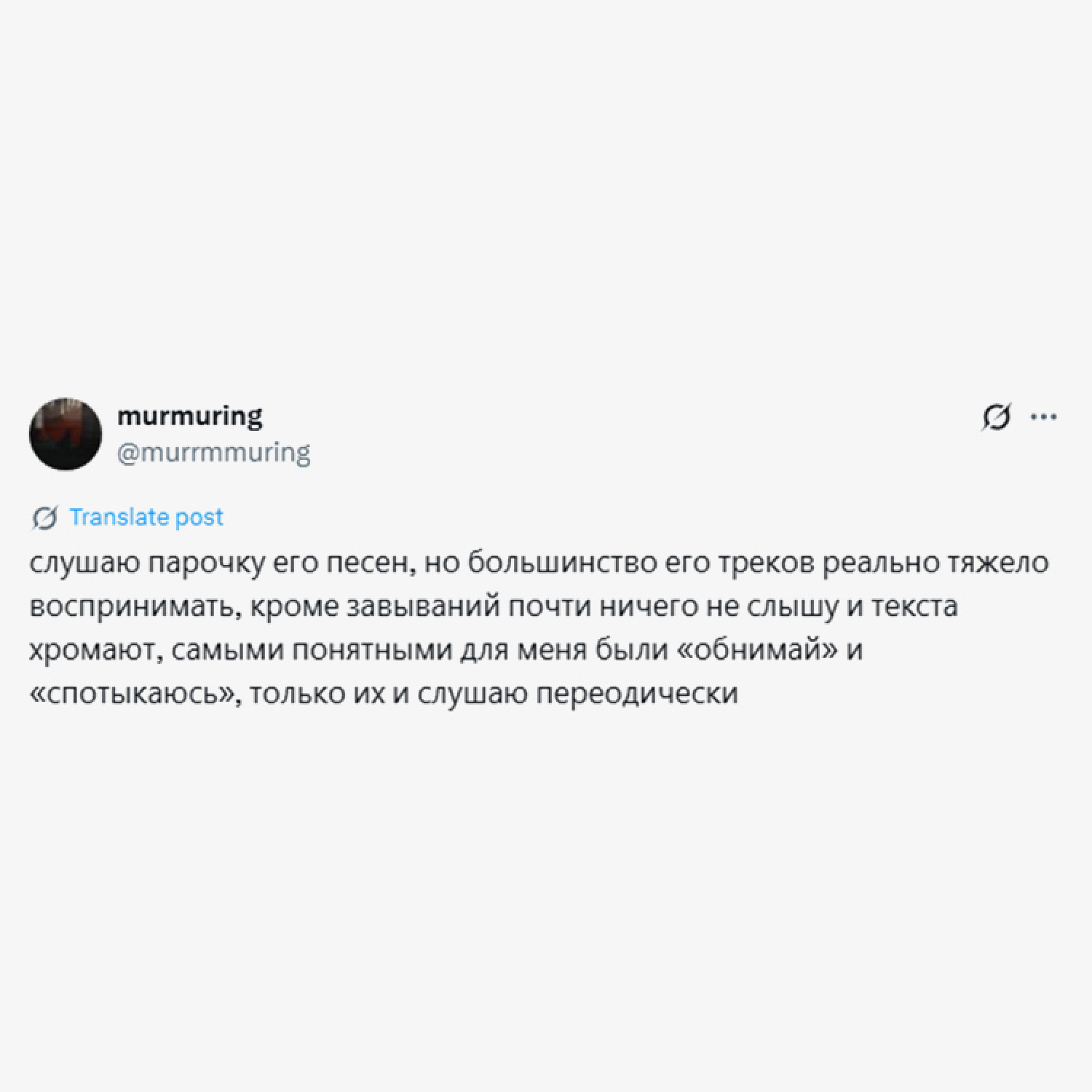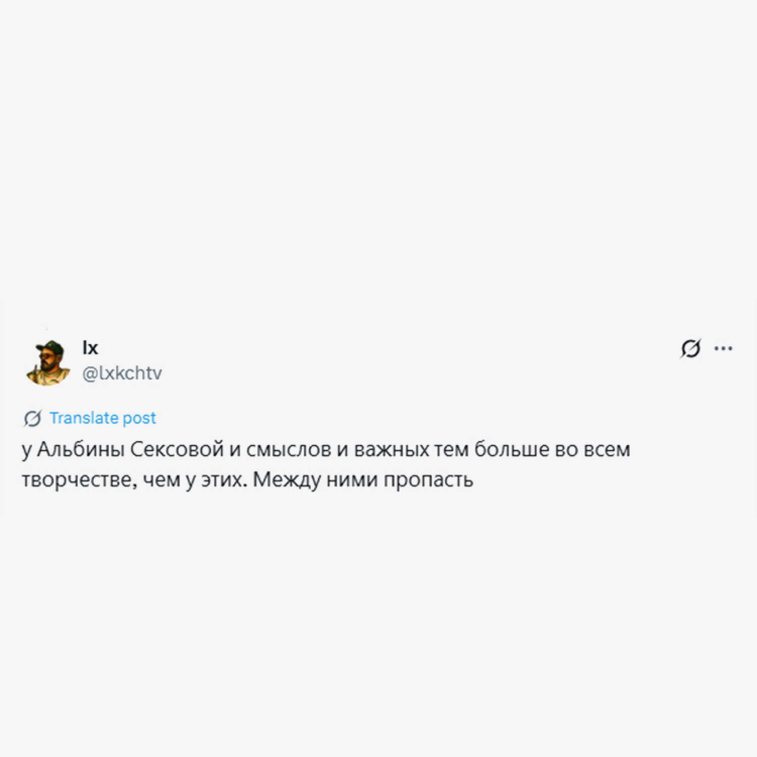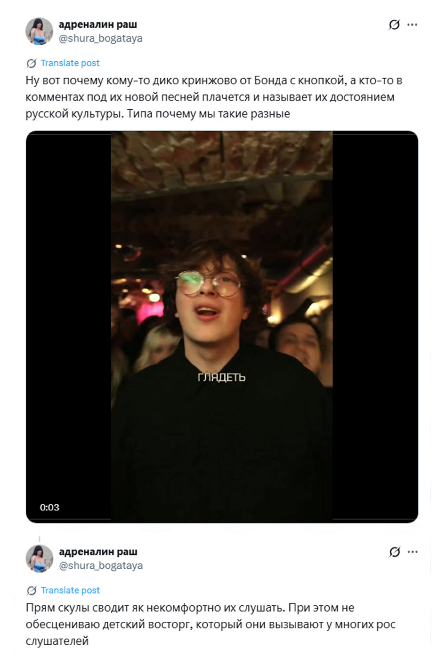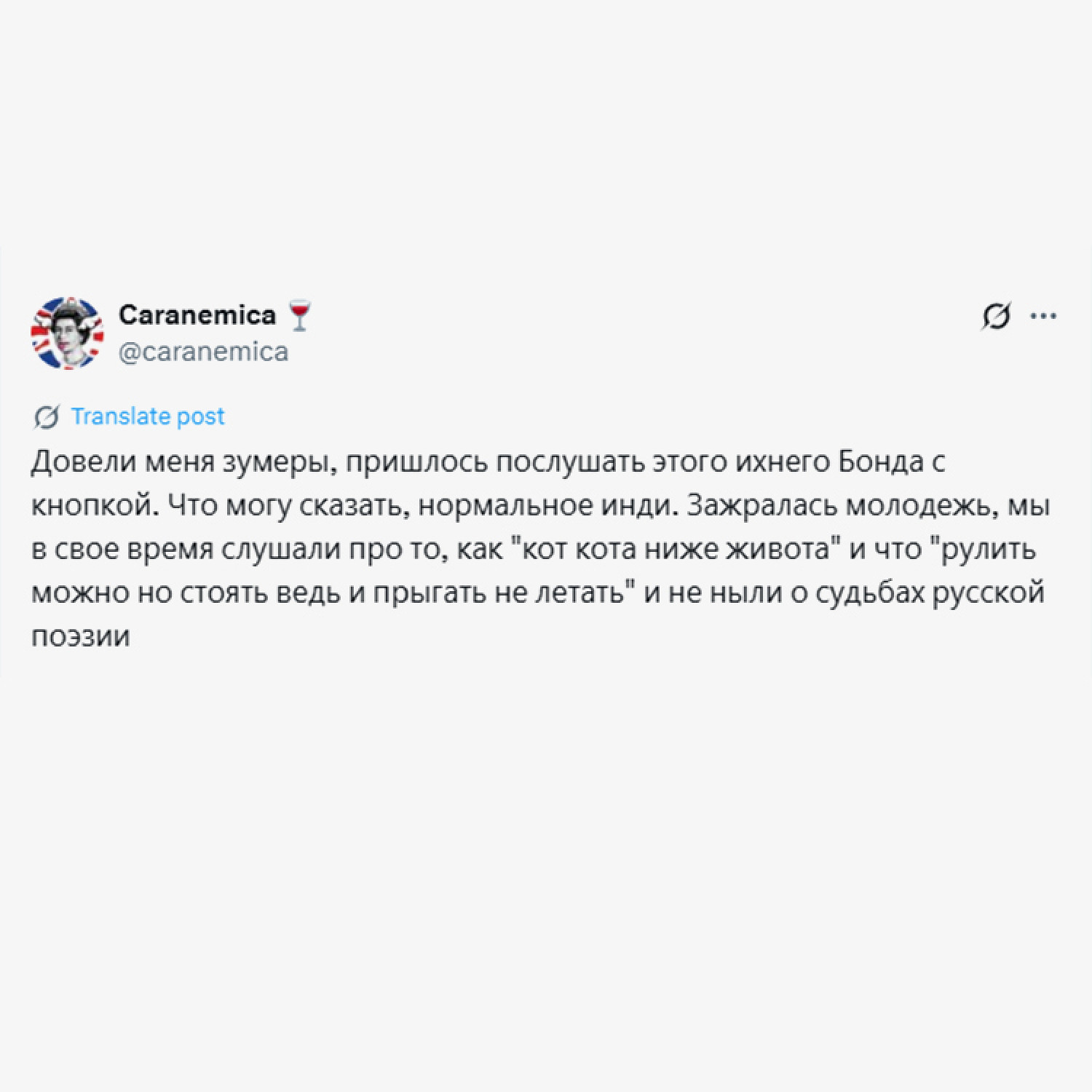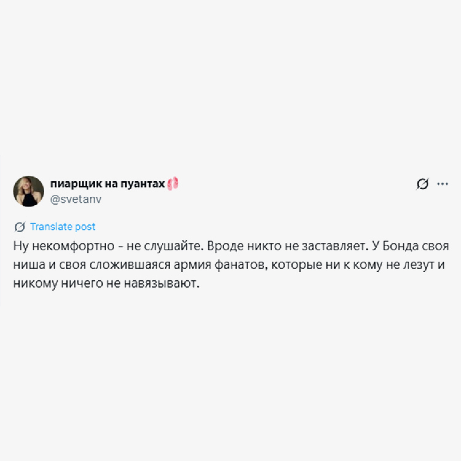 Большинство твиттерских не согласились с таким подходом к оценке лирики. Они подчеркивали, что слушают «Бонд» ради мелодии, вокала и вайба, а не текста. Кого‑то позабавило, что все резко «начали шарить за качественную поэзию». Мнение Распопова активно оспаривали: хрущевки вполне могут быть бережными, если лирический герой ассоциирует их с уютом и светлыми временами, а строчка «свобода цвета кителя Сталина» — это намеренный оксюморонСредство художественной выразительности, при котором сочетаются слова, противоречащие друг другу, например словосочетания «живой труп» и «оглушительная тишина». , суть которого не в фактическом оттенке, а в образном противоречии, передающем ощущение несвободы.